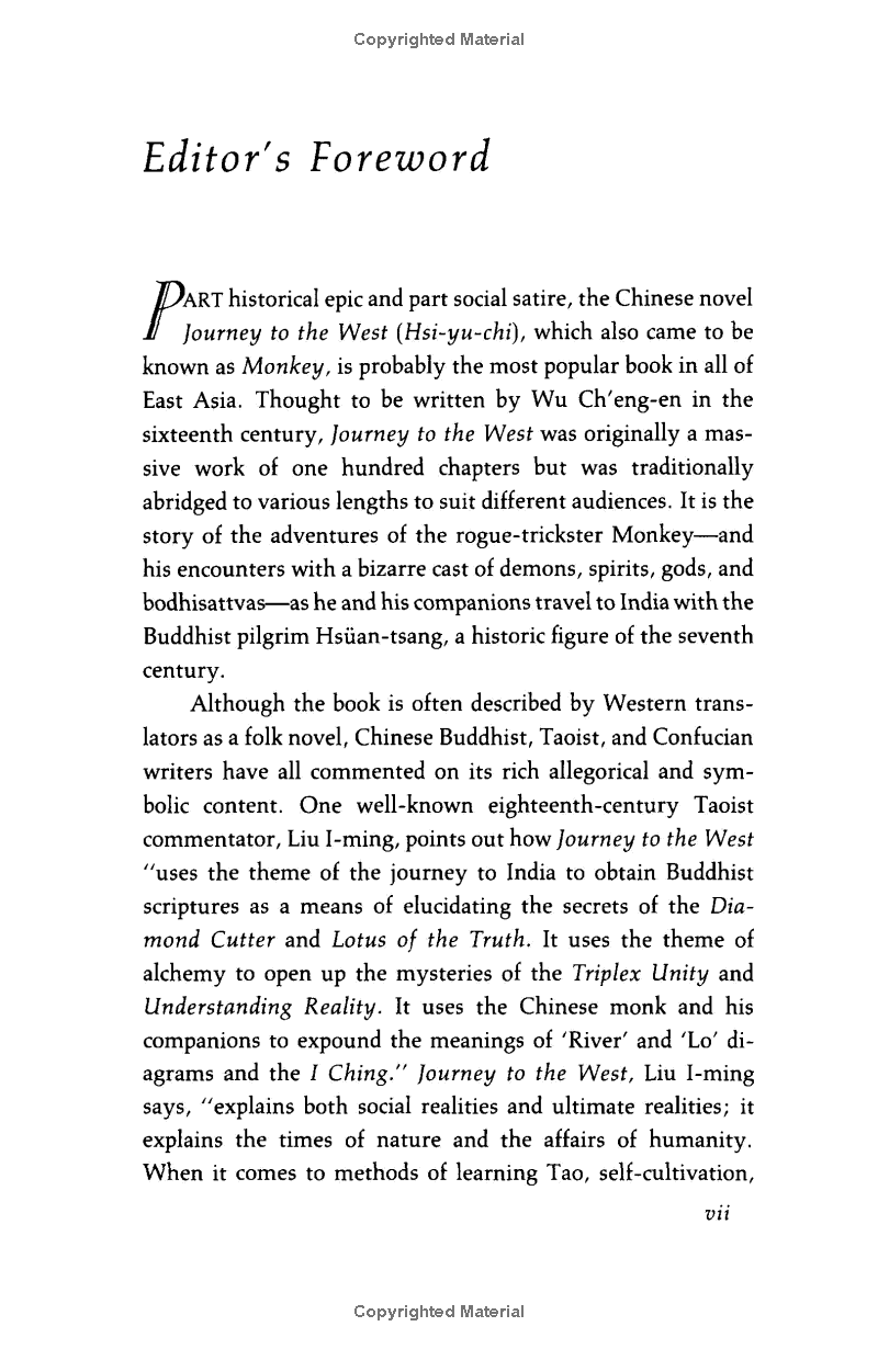 Part spiritual ge, part historical epic, the folk novel Journey to the West, which came to be known as Monkey, is the most popular classic of Asian literature. Originally written in the sixteenth century, it is the story of the adventures of the rogue-trickster Monkey and his encounters with a bizarre cast of characters as he travels to India with the Buddhist Tripitaka in search of sacred scriptures.
