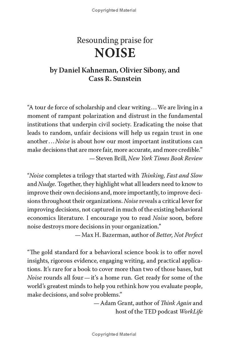 In Noise, Daniel Kahneman, Olivier Sibony, and Cass R. Sunstein show the detrimental effects of noise in many fields, including medicine, law, economic forecasting, forensic science, bail, child protection, strategy, performance reviews, and personnel selection. Wherever there is judgment, there is noise. Yet, most of the time, individuals and organizations alike are unaware of it. They neglect noise. With a few simple remedies, people can reduce both noise and bias, and so make far better decisions.