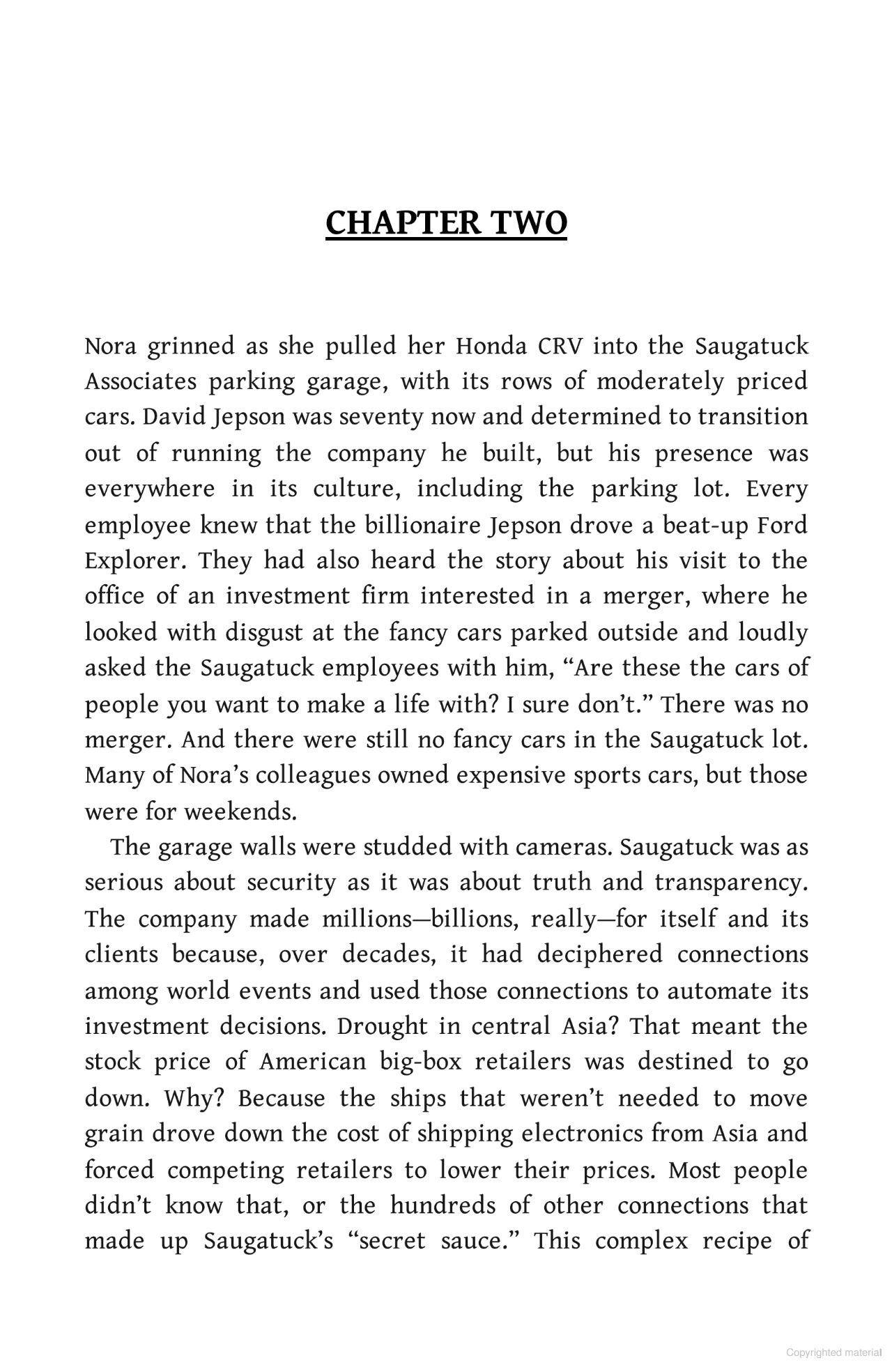 It’s been two years since Nora Carleton left the job she loved at the US Attorney’s Office to become counsel at Saugatuck Associates, the world’s largest hedge fund. The career change also meant a change of scenery, relocating her to Westport, Connecticut, fifty miles north of New York City. But it was worth it to get her daughter, Sophie, away from the city. Plus, she likes the people she works with. Especially Helen, who recruited Nora because of her skills as an investigator.