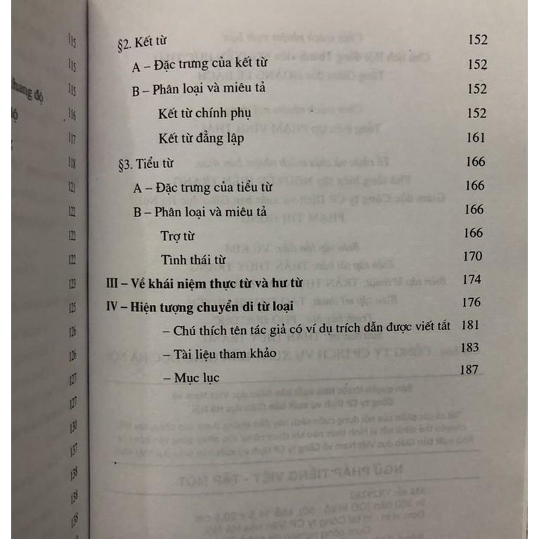 Nội dung gồm có: Phần một. Cấu tạo từ Phần hai. Từ loại tiếng Việt Phần ba. Cụm từ Chương I. Khái quát về cũng từ Chương II. Cụm danh từ Chương III. Cụm động từ Chương IV. Cụm tính từ Phần bốn. Câu Chương I. Câu đơn Chương II. Câu ghép Chương III. Câu phân loại theo mục đích nói Chương IV. Câu phủ định Tác giả: Diệp Quang Ban, Hoàng Văn Trung Số trang: 192+260 Xuất bản: 2025 Nhà xuất bản: Giáo dục Việt Nam Công ty phát hành: Nxb Giáo dục Việt Nam NTBOOKS Chắp cánh tri thức - Vững bước tương lai
