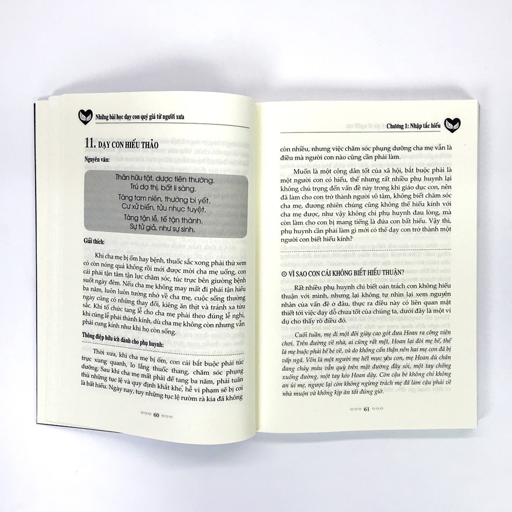 Cuốn sách “Những bài học dạy con quý giá từ người xưa” phân tích tỉ mỉ, rõ ràng và đưa ra những ví dụ cụ thể sinh động về các phương pháp nuôi dạy con thời cha ông để lại như: dạy con làm thế nào để con cái biết lắng nghe; phê bình con cái thế nào để có hiệu quả nhất; dùng hành động thực tế để dạy con cái biết yêu thương cha mẹ; Cuốn sách giúp các bậc cha mẹ luôn hết mực yêu thương con cái trở nên thông thái hơn, giúp con phát triển toàn diện, tạo cho con môi trường sống lành mạnh!
