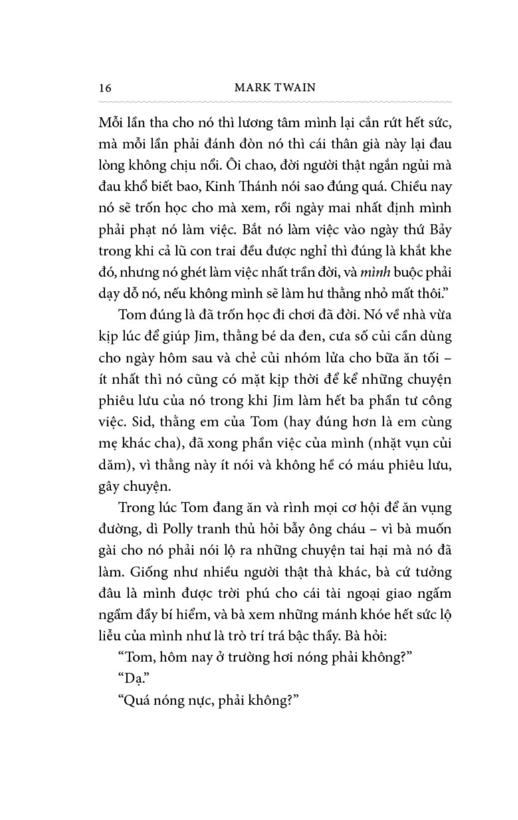 Toàn bộ tác phẩm tắm trong một không khí hoạt náo, tươi vui và lấp lánh những màu sắc rực rỡ của trẻ em. Tài kể chuyện của Mark Twain khiến người đọc vừa bị cuốn hút, vừa lo âu đồng thời liên tục bật cười trước những tình huống kịch tính liên tiếp. Tác giả còn lồng vào những đoạn văn châm biếm xã hội vô cùng hài hước và sâu sắc. Trên hết, ông miêu tả xuất sắc tính cách, tâm lý, hành động của một Tom Sawyer thông minh, nghịch ngợm nhưng dũng cảm và có một tấm lòng nhân hậu, giàu tình nghĩa.
