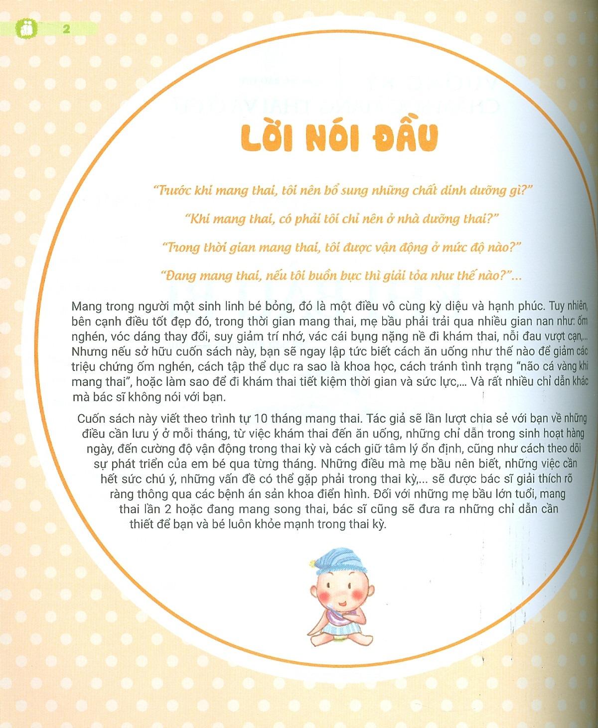 Với kinh nghiệm của một bác sĩ trưởng khoa Sản, tác giả sẽ chia sẻ chi tiết với bạn về những việc cần làm và cần lưu ý ở mỗi tháng mang thai. Nếu bạn là mẹ bầu và đang lo lắng không biết nên ăn gì, tập thể dục thế nào để vừa giữ được vóc dáng vừa không sợ ảnh hưởng đến con, lo ốm nghén làm con thiếu chất, lo tiểu đường thai kỳ và các biến chứng nguy hiểm, lo con bị dị tật bẩm sinh, lo trầm cảm u uất, lo m.ình sức khỏe kém khó sinh thường,… Tất tần tật các nỗi lo của mẹ bầu đều được bác sĩ tư vấn và giải quyết qua từng trường hợp bệnh án Sản khoa điển hình, được viết trong cuốn sách này.