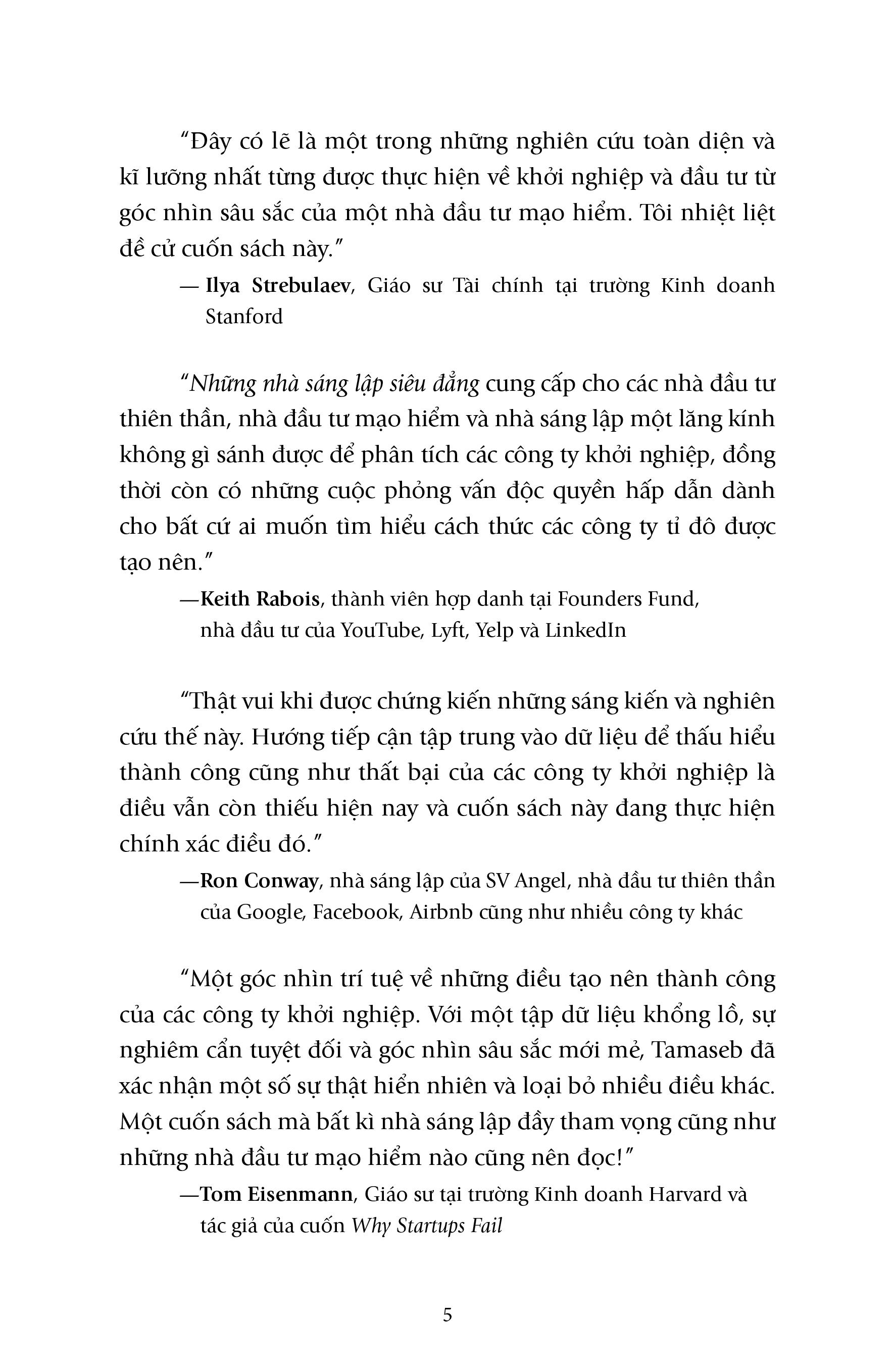 Điểm nổi bật đáng chú ý của Những nhà sáng lập siêu đẳng là tập dữ liệu có thể coi là lớn nhất từng được thu thập về các công ty khởi nghiệp, với mục đích so sánh các công ty khởi nghiệp trị giá hàng tỉ đô la với những công ty khởi nghiệp không thành công – 30.000 điểm dữ liệu trên rất nhiều yếu tố như số lượng đối thủ cạnh tranh, quy mô thị trường, tuổi của người sáng lập, xếp hạng trường đại học họ từng theo học, chất lượng của các nhà đầu tư, thời gian gây quỹ và còn nhiều hơn thế. Và những gì tác giả tìm thấy sau hàng nghìn giờ nghiên cứu và phân tích dữ liệu, trông khác xa so với mong đợi:
