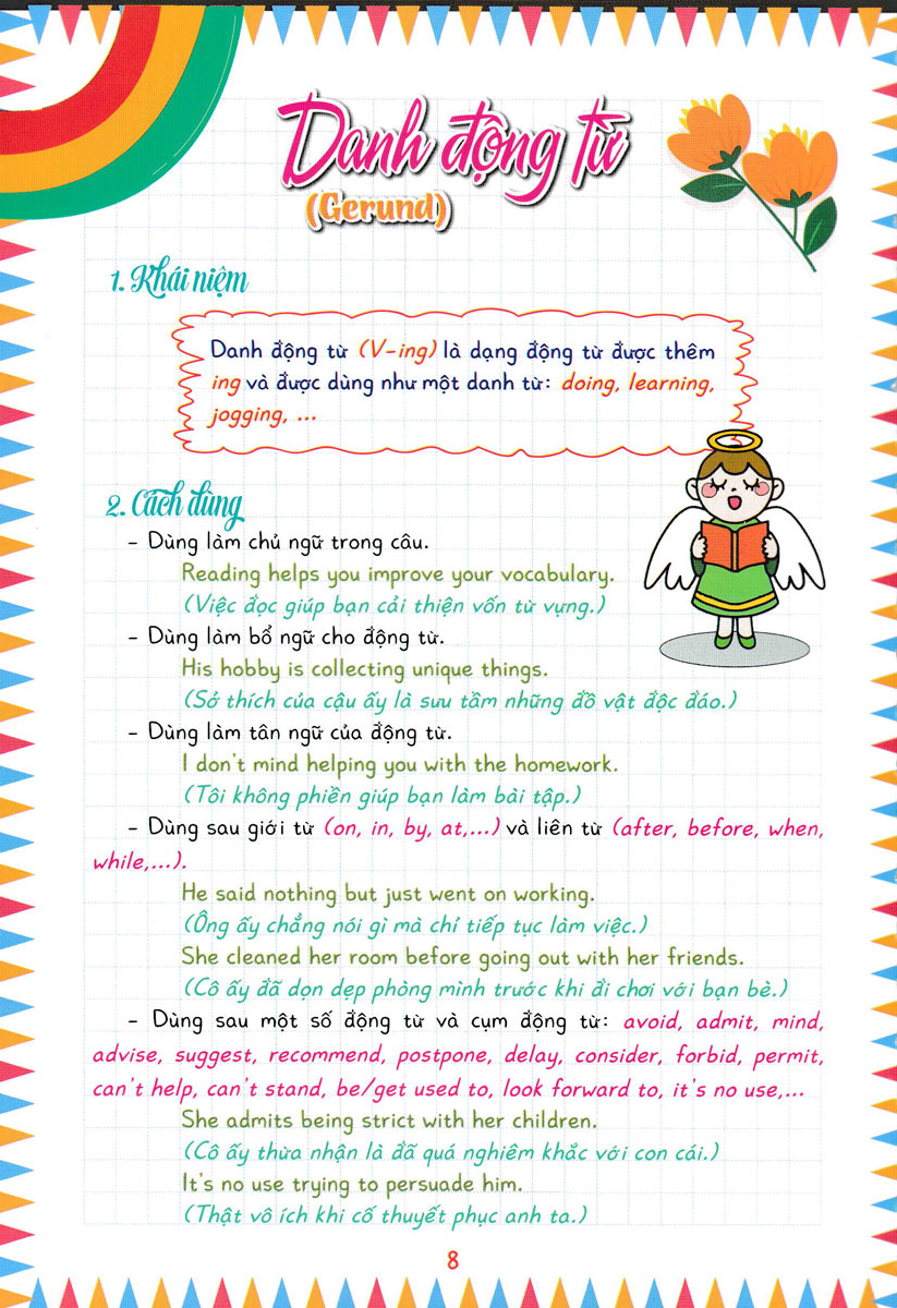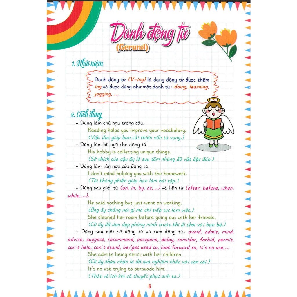 Sách tóm tắt các điểm ngữ pháp theo kiểu ghi chú ngắn gọn, giúp các em dễ dàng ghi nhớ cách dùng các mạo từ a, an, the; cách dùng động từ nguyên mẫu có to và danh động từ; các động từ chỉ sự yêu ghét; so sánh hơn của trạng từ; công
