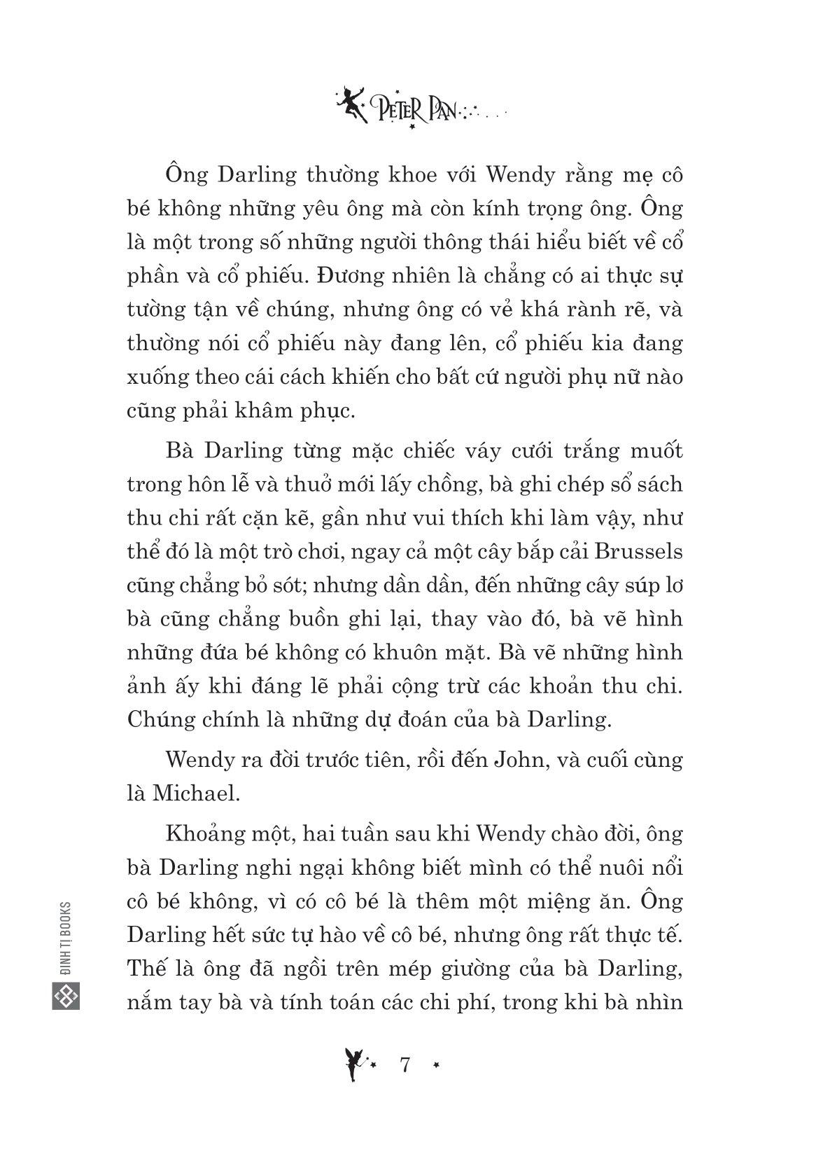Câu chuyện bắt đầu trong phòng,,trẻ của gia đình Darling ở London, nơi Wendy,,,John và Michael đang đi ngủ thì bất ngờ trước sự xuất,,hiện của Peter Pan và nàng tiên Tinker Bell. Ba chị em đã,,theo Peter đến Neverland và chuyến phiêu lưu của họ bắt đầu.,,Đề cập đến các chủ đề như tình mẫu tử, thiện, ác và tình,,yêu, Peter Pan là một cuộc phiêu lưu trong văn chương mang,,đến cho người đọc cái nhìn hoài niệm về quá khứ trẻ thơ đầy,,mơ mộng, khuyến khích ta nhìn lại bản thân từng trẻ trung,,và giàu trí tưởng tượng biết bao, nhắc nhở ta đừng bao giờ,,ngừng tin tưởng chính m.ình. Câu chuyện thiếu nhi kinh,,điển của J. M. Barrie không chỉ là câu chuyện về tiên,,,về những tên cướp biển hay gã thuyền trưởng khét,,tiếng Hook, Peter Pan còn là cuộc đấu tranh vượt,,thời gian của những tâm hồn giữa việc giữ mãi sự ngây,,thơ hồn nhiên hay cần lớn lên và trưởng thành.