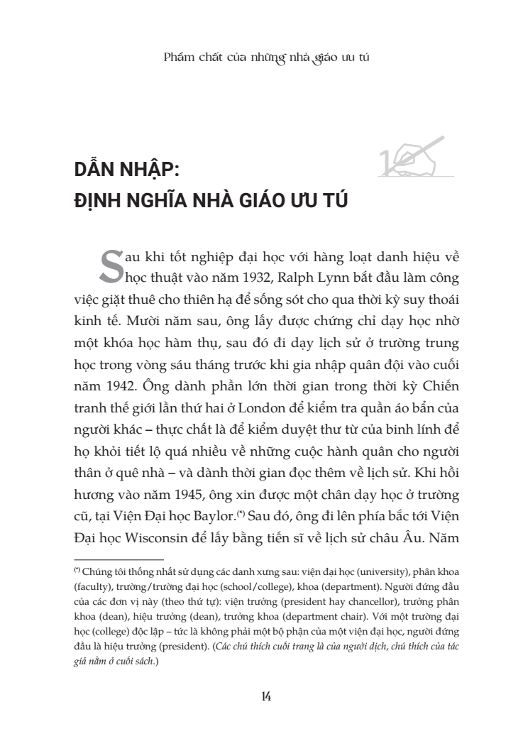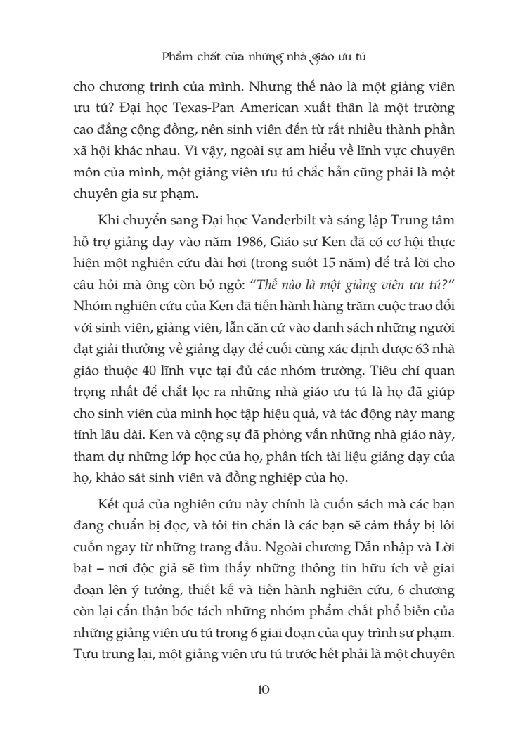 Cuốn sách gồm 7 chương và phần lời bạt, cung cấp cho chúng ta những kiến thức chi tiết và đa chiều về phương pháp giảng dạy của những nhà giáo xuất chúng nhất trong lĩnh vực giáo dục đại học tại Hoa Kỳ. Khi viết cuốn sách này, tác giả cùng các cộng sự đã phỏng vấn, dự khán, phân tích tài liệu giảng dạy cũng như khảo sát sinh viên, đồng nghiệp của 63 nhà giáo thuộc 40 lĩnh vực khác nhau trên toàn nước Mỹ, từ toán học, khoa học tự nhiên cho tới kịch nghệ, lịch sử. Thông qua những cuộc phỏng vấn này, tác giả đã đưa ra kết luận về những phẩm chất của các nhà giáo ưu tú, dựa trên 6 câu hỏi cơ bản: