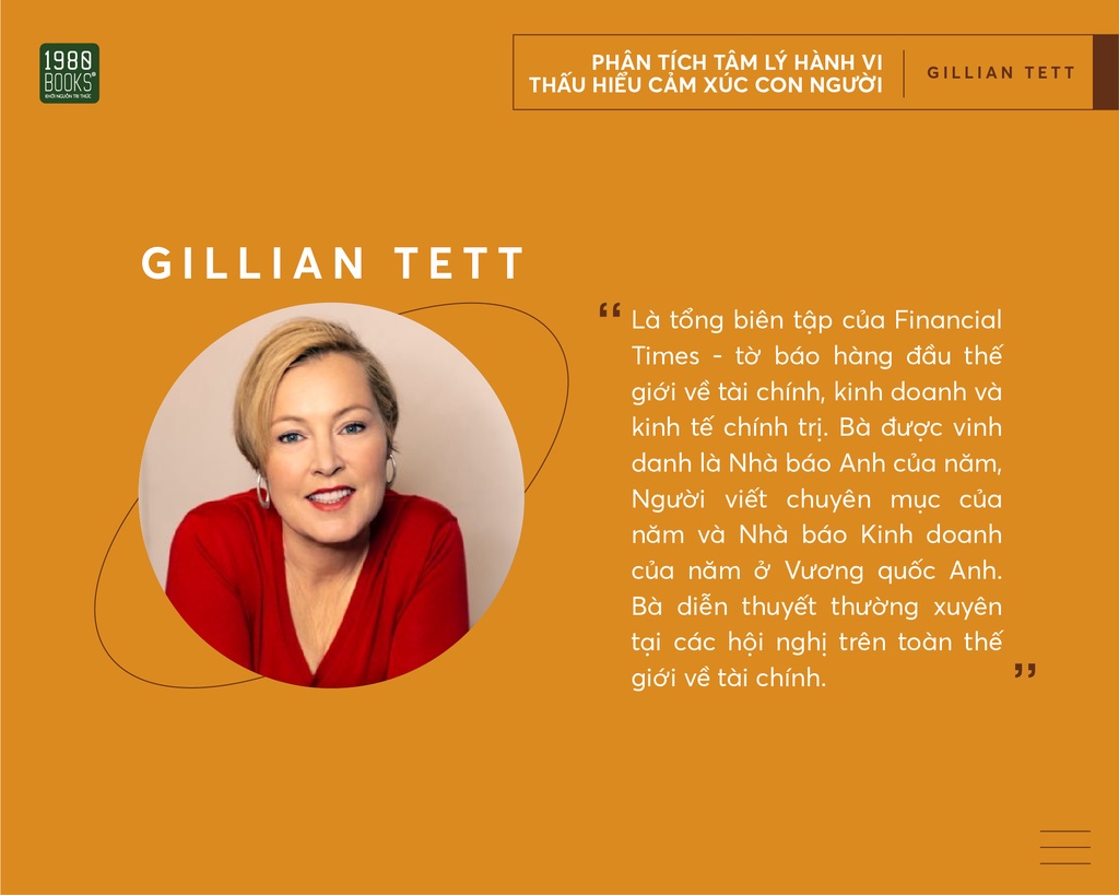 Gillian Tett là Tổng biên tập của Financial Times và viết các chuyên mục cho tờ báo hàng đầu thế giới về tài chính, kinh doanh và kinh tế chính trị. Bà được vinh danh là Nhà báo Anh của năm, Người viết chuyên mục của năm và Nhà báo Kinh doanh của năm ở Vương quốc Anh và giành được hai giải thưởng của Hiệp hội Viết và Biên tập Kinh doanh Tiến bộ tại Mỹ. Bà diễn thuyết thường xuyên tại các hội nghị trên toàn thế giới về tài chính và thị trường toàn cầu và có bằng Tiến sĩ Nhân học xã hội tại Đại học Cambridge. Tett là tác giả của Saving the Sun: How Wall Street Mavericks Shook Up Japan’s Financial World and Made Billions; Fool’s Gold: The Inside Story of J.P. Morgan and How Wall St. Greed Corrupted Its Bold Dream and Created a Financial Catastrophe, và The Silo Effect: The Peril of Expertise and the Promise of Breaking Down Barriers.