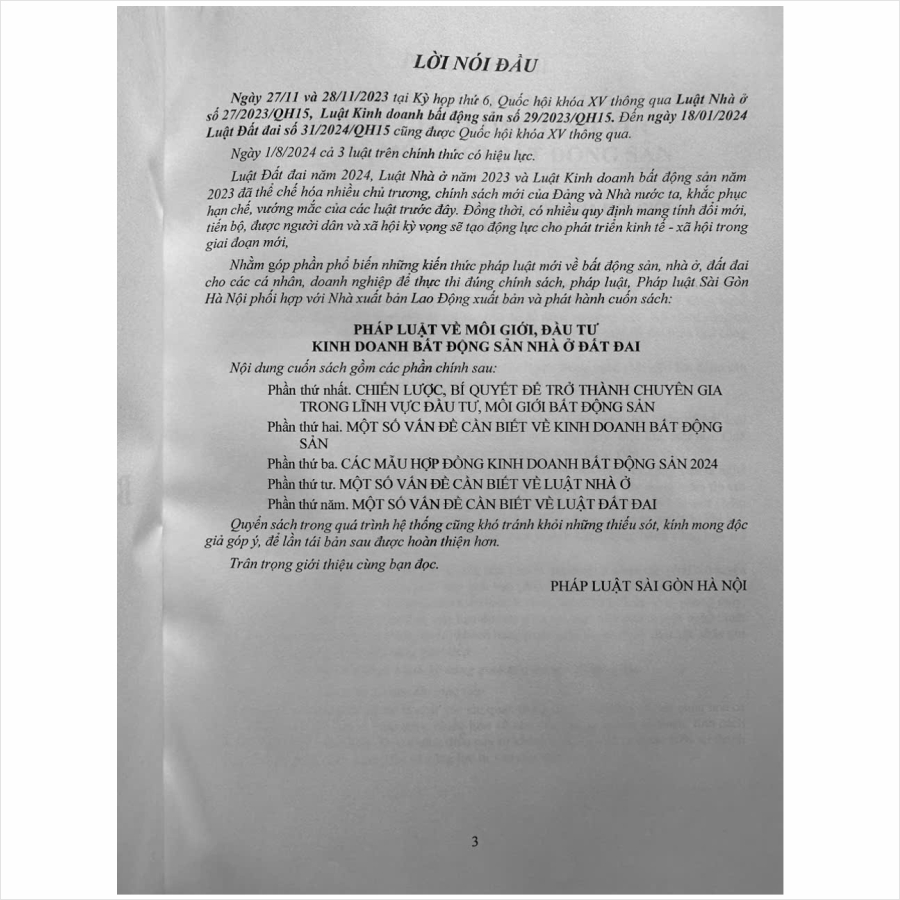 Nhằm phổ biến đến Quý Cơ quan, Đơn vị và Quý khách hàng thân thiết nắm bắt kịp thời những quy định mới nêu trên. Nhà sách Nam Việt xin trân trọng giới thiệu cuốn sách: Pháp Luật Về Môi Giới, Đầu Tư Kinh Doanh Bất Động Sản Nhà Ở và Đất Đai