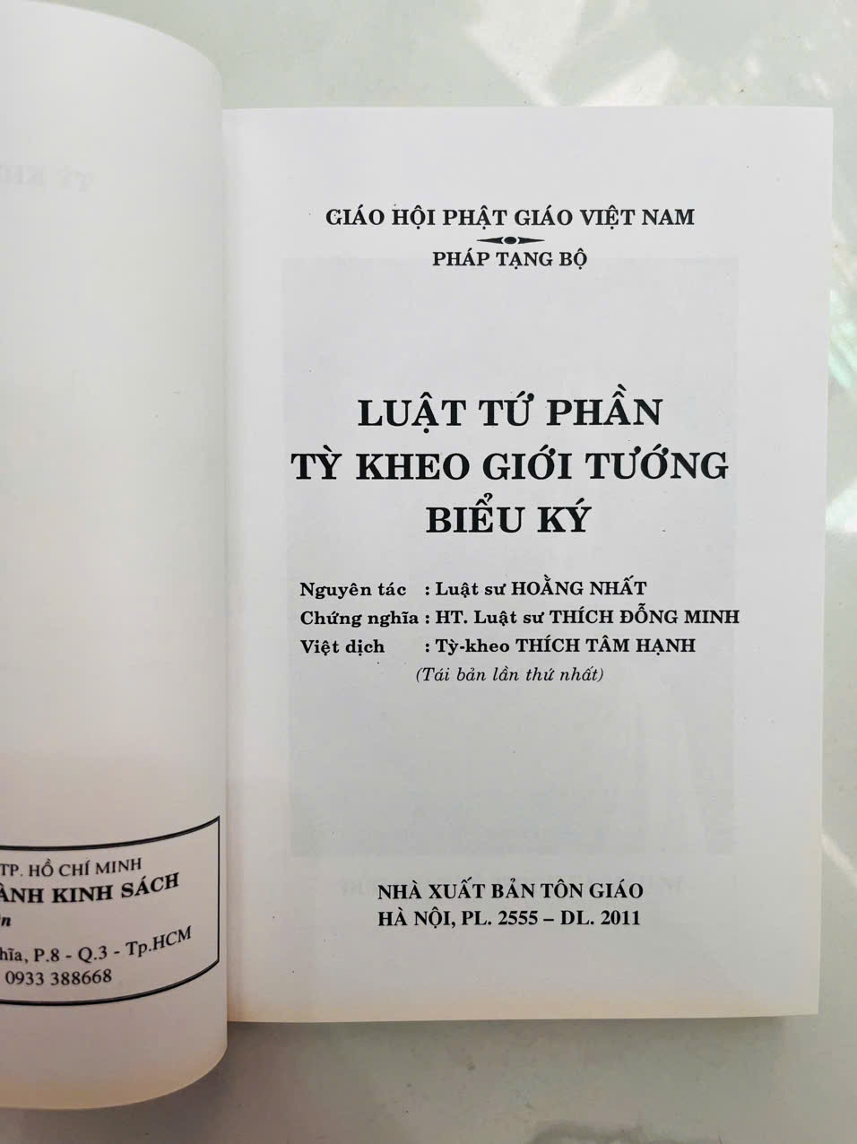 Sách - Pháp Tạng Bộ - Luật Tứ Phần Tỳ Kheo Giới Tướng Biểu Ký     Bộ "Tứ Phần Luật Tỳ Kheo Giới Tướng Biểu Ký" này là một trong ba bộ Luật mà khi còn sanh tiền Hòa thượng Luật sư Thích Thiện Hòa, Giám đốc Phật Học Đường Nam Việt, Viện chủ chùa Ấn Quang đưa và bảo tôi xem. Hai bộ kia là "Tứ Phần Luật San Bổ Tùy Cơ Yết Ma Huyền Ty Sao" và "Yết Ma Chỉ Nam". Trước uy đức và sự ưu ái chiếu cố của ngài, tôi không dám thưa hỏi : "Thầy cho con luôn hay cho mượn ?". Sau khi ngài viên tịch, tôi suy nghĩ : "Số sách này, nếu ngài không cho mà mình không hoàn lại đệ tử ngài là điều không nên". Vì vậy, tôi quyết định trao lại ngay bộ Yết Ma Chỉ Nam cho thầy Minh Thành (vì Hòa thượng Trí Thủ đã cho tôi một bộ), còn bộ Yết Ma Huyền Ty và bộ Tứ Phần Biểu Ký này cũng sẽ giao hoàn sau khi nhờ thầy Hành Đạo chép lại, vì tôi thấy rất hay.   Thông tin sản phẩm: Khổ sách: 14.5x20.5 cm Nhà xuất bản Tôn Giáo Năm phát hành: 2014 Số trang: 310 trang Nguyên tác : Luật sư Hoằng Nhất Chứng Nghĩa ; HT Luật sư Thích Đỗng Minh Việt dịch: HT Thích Tâm Hạnh Nhà phát hành: Hương Trang Bìa mềm