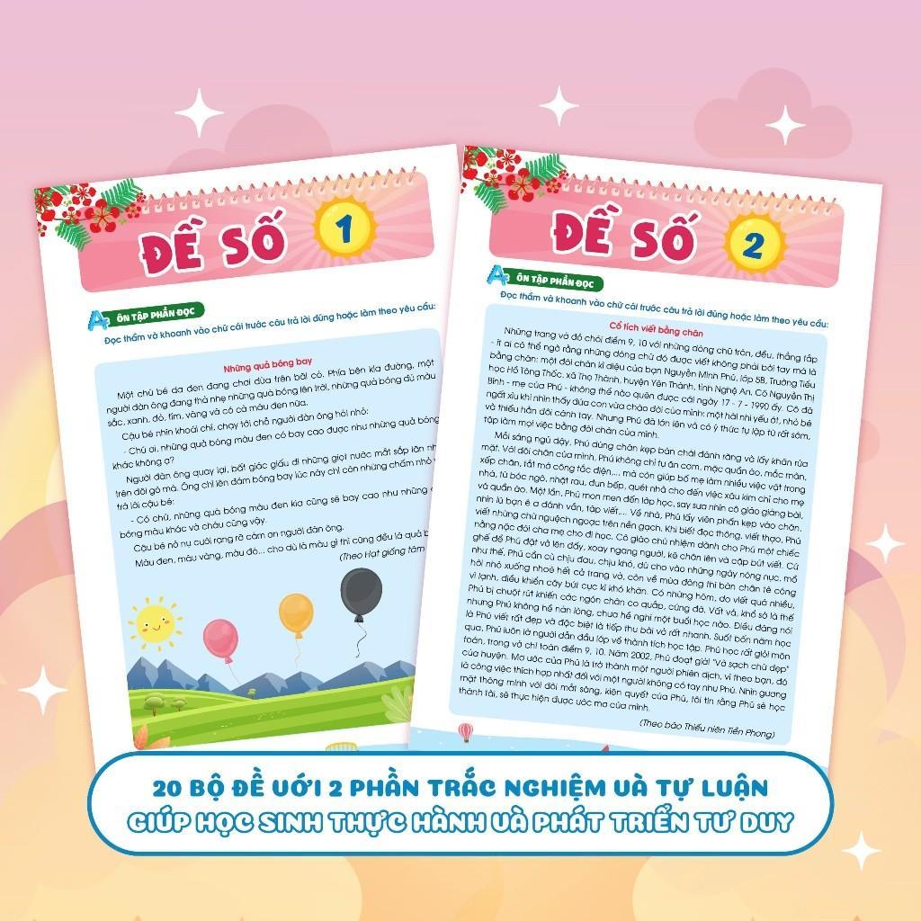 - 20 bộ đề đa dạng Cuốn sách bao gồm 20 bộ đề, mỗi bộ đề gồm 2 phần Phần đọc và Phần viết. Điều này giúp các em thực hành và nắm vững kiến thức thông qua các dạng bài tập khác nhau. Sự đa dạng này cũng giúp rèn luyện khả năng tư duy, suy luận và kích thích trí tưởng tượng của các em nhỏ. Phần viết của cuốn sách cũng giúp các con luyện chính tả, phân biệt được các chữ cái, từ, các vần dễ bị nhầm lẫn thường gặp
