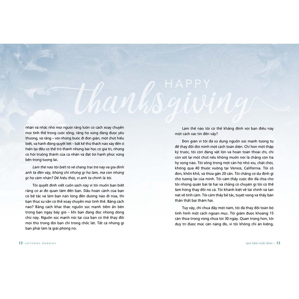 Qua cuốn sách này, Anthony Robbins gửi gắm bạn đọc thông điệp: “Cách duy nhất để cảm nghiệm sự màu mỡ, dư dật của cuộc sống chính là chiêm nghiệm nó với thái độ tri ân - Nhận biết những gì bạn đang có và những gì bạn có thể cho đi. Cách tuyệt nhất để đảm bảo cho hạnh phúc của bạn là giúp đỡ người khác trải nghiệm hạnh phúc của riêng họ”.