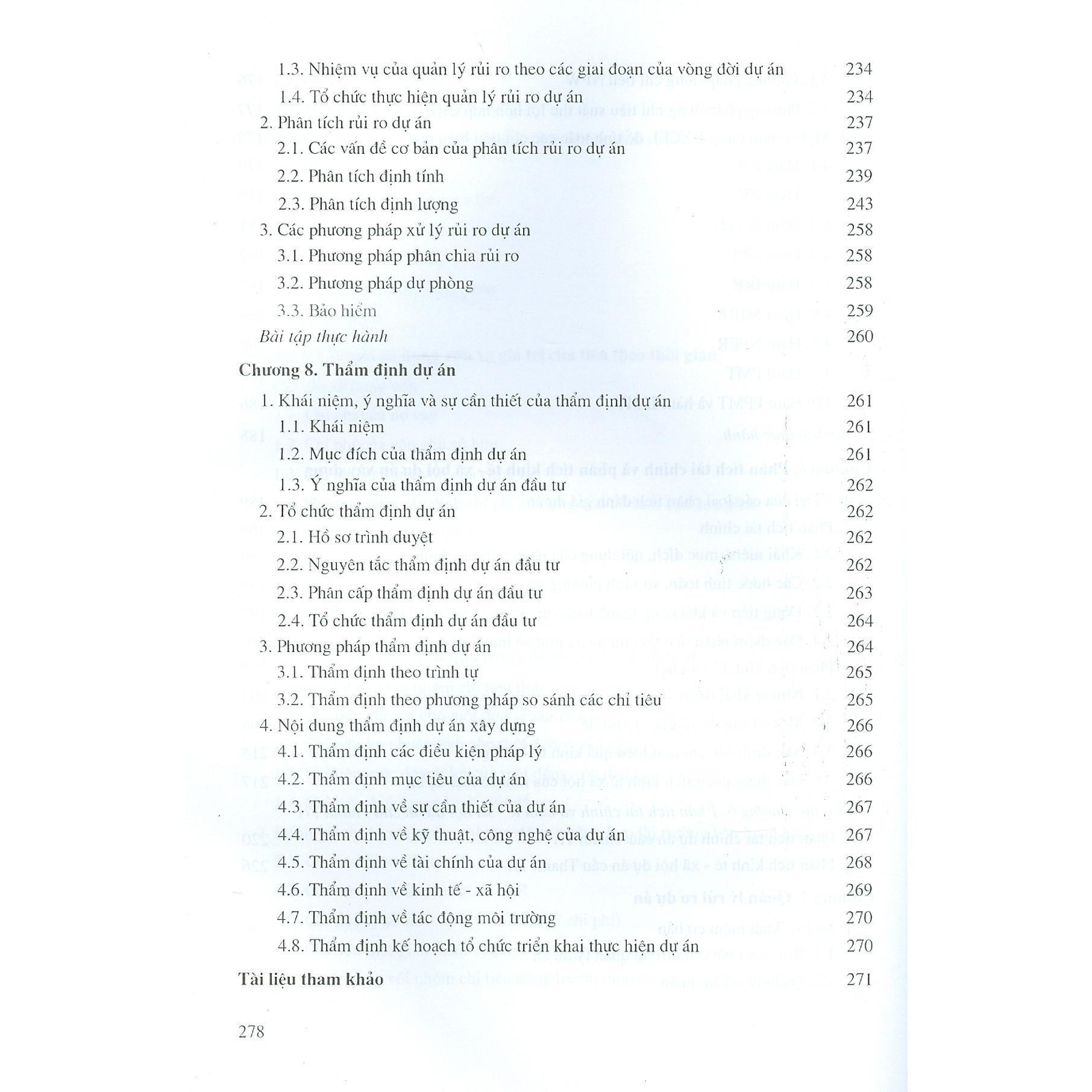 - Quyển 3: Quản lý dự án xây dựng - Giai đoạn thi công xây dựng công trình. Tài liệu này là quyển "Quản lý dự án xây dựng - Lập và thẩm định dự án" và đi sâu nghiên cứu các vấn đề từ khi dự án còn trong ý tưởng đầu tư đến khi được phê duyệt, có quyết định đầu tư. Trong quyển này, ngoài các ví dụ cụ thể, còn giới thiệu các nội dung chính của dự án đầu tư xây dựng cầu Thanh trì và các thực hành cụ thể gắn với dự án đó. Bộ tài liệu về quản lý dự án xây dựng có thể dùng để tham khảo hữu ích không chỉ cho các sinh viên, học viên các chuyên ngành kinh tế và quản lý xây dựng mà còn hữu ích cho các cán bộ quản lý kinh tế - kỹ thuật đang làm việc trong ngành xây dựng. Mục Lục TRANG Lời nói đầu 3 Danh mục ký hiệu và các từ viết tắt 5 Chương 1. Dự án đầu tư xây dựng công trình