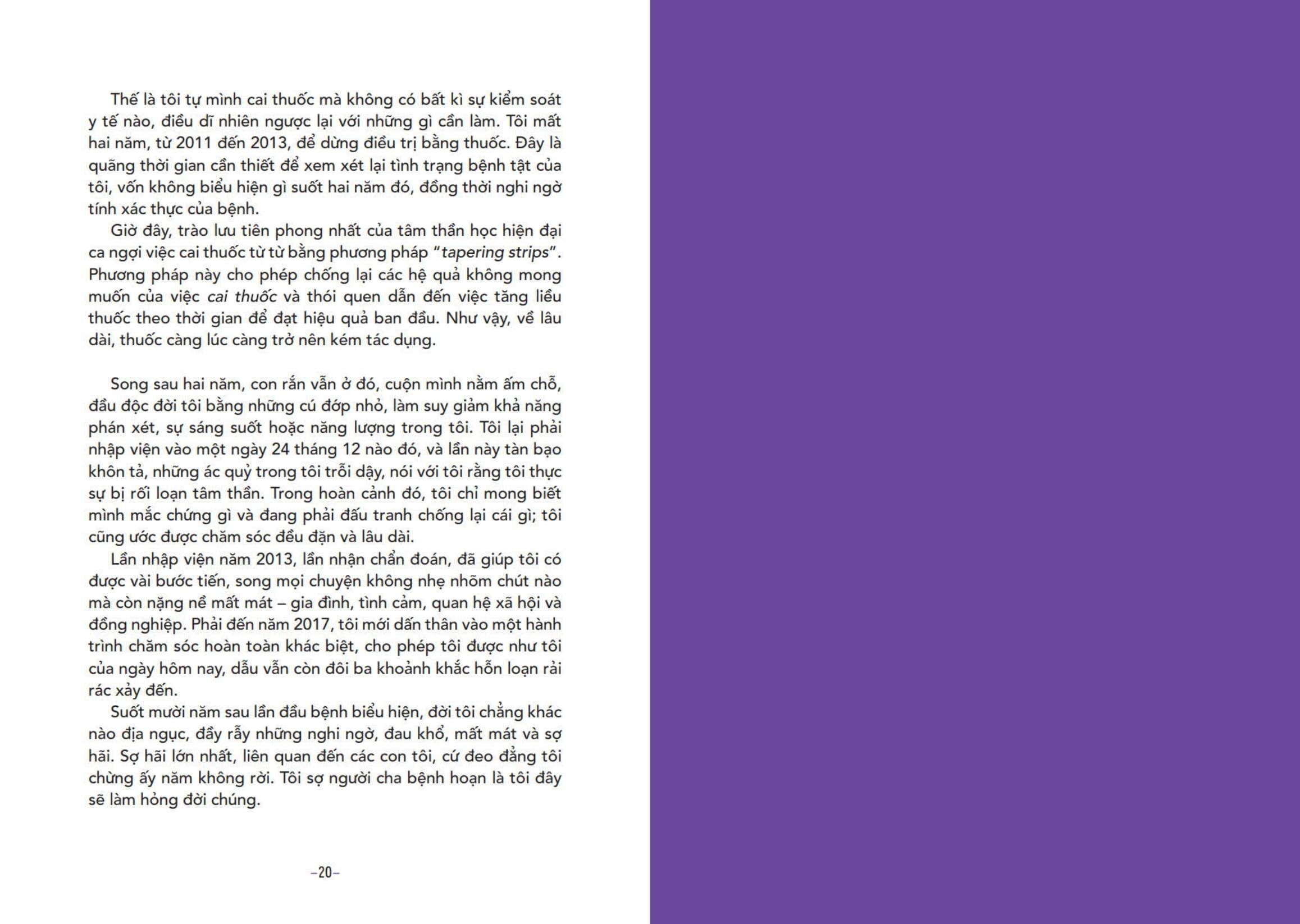 Rối Loạn Lưỡng Cực - Hành Trình Dài Chung Sống - Trò Chuyện Về Sức Khoẻ Tâm Thần - Từ Chẩn Đoán Đến Cuộc Sống Hằng Ngày Rối Loạn Lưỡng Cực - Hành Trình Dài Chung Sống là cuốn sách sống động với nhiều hình ảnh minh hoạ giúp chúng ta hiểu rõ hơn về chứng rối loạn lưỡng cực và phần nào giải đáp những băn khoăn nảy sinh: Làm cách nào để xác định rối loạn lưỡng cực? Chứng bệnh này có thể chữa khỏi được không? Cuối cùng, phải chung sống với nó ra sao? Tuy còn xa lạ với nhiều người, song rối loạn lưỡng cực lại ảnh hưởng tới từ 1 - 2,5% dân số. Dẫu vậy, khi mắc bệnh, bệnh nhân vẫn phải trải qua cuộc đấu tranh thực sự: không được thừa nhận, bị kì thị, hành trình chẩn đoán gian nan, khó khăn trong kiểm soát triệu chứng… Người rối loạn lưỡng cực thường cảm thấy cô độc và không được ai thấu hiểu. Bằng kinh nghiệm sống và hành trình y tế từng trải qua, cùng sự đồng hành của bác sĩ Céline Renouard, tác giả Fabrice Saulière đã kể lại hành trình cuộc đời của m.ình, hé lộ với chúng ta thế nào là cuộc sống thực sự của một người rối loạn lưỡng cực, đồng thời đưa ra những lời khuyên giá trị để có thể “chung sống” với rối loạn lưỡng cực tốt hơn trong cuộc sống hằng ngày.