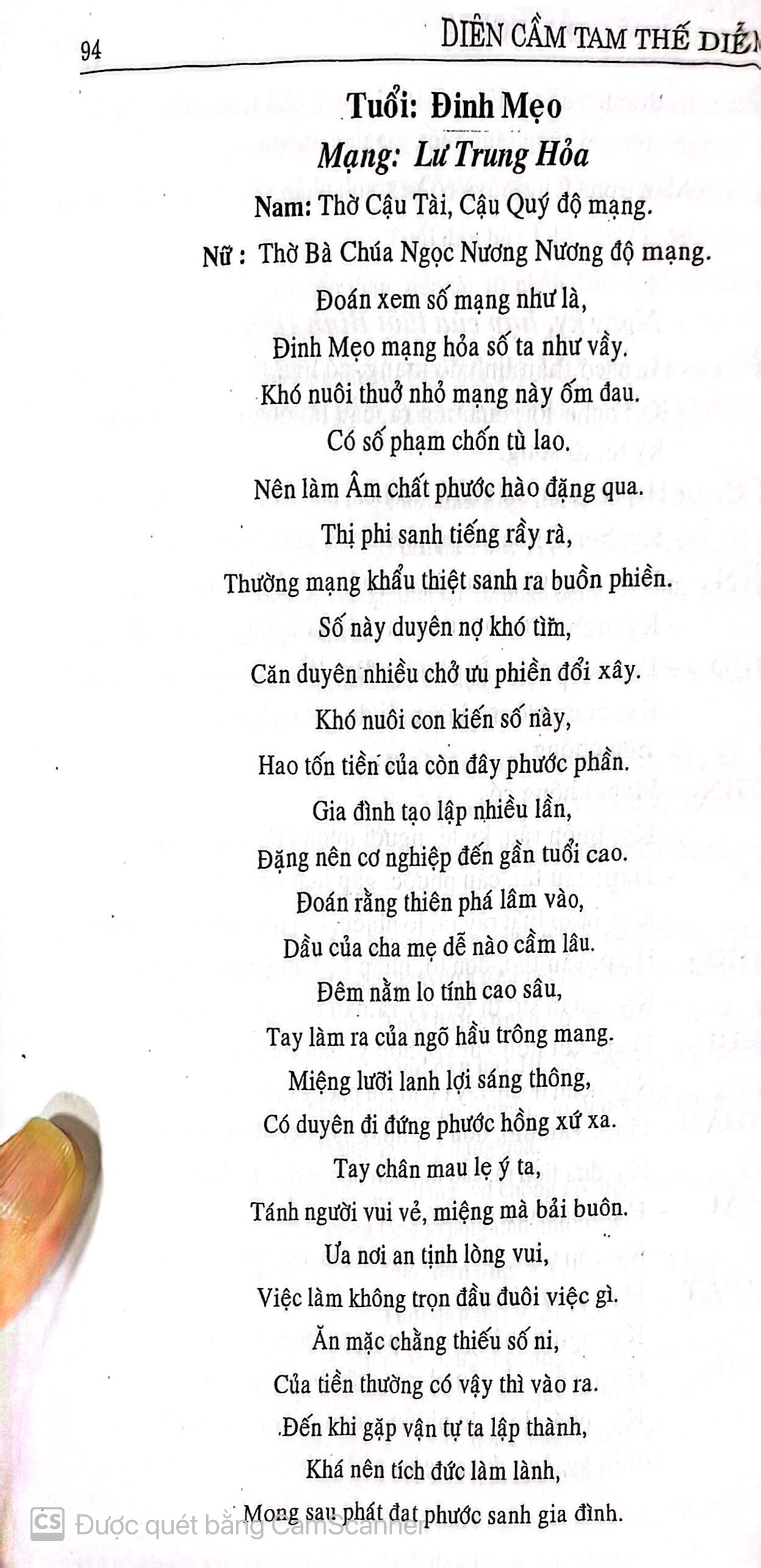 Ngoài ra, cuốn sách sẽ cho biết tiền kiếp của bạn ra sao, tác động đến vận mệnh hiện tại tương ứng thế nào. Ví dụ như: Trước có tu hành và có cứu người, cho nên kiếp này đặng lộc thực đầy đủ, của tiền nhiều, có điền viên rộng, có chức phận sang trọng, đặng sống lâu, đi xứ khá hơn. THÔNG TIN TÁC GIẢ Dương Công Hầu (Hiệu Khương Đức) sinh 1928 quê hương ở làng Khánh Bình, Quân Cà Mau, Tỉnh Bạc Liêu. Thân sinh của ông là nhà nho học lưu truyền, thạo thông sách số, tinh thông kinh nghiệm diễn luận vận mệnh con người. Soạn giả Dương Công Hầu được cha truyền lại toàn bộ bí kíp để kế nghiệp. Thấy sách số cùng những bí kíp truyền lại nói rõ tỉ mỉ chi tiết những việc dĩ vãng không sai, lại còn thông hiểu những việc vị lai quả quyết, tiên tri, bá vô nhất thất nên ông đã dày công sức để biên soạn cuốn Diễn Cầm Tam Thế. #diencamtamthe