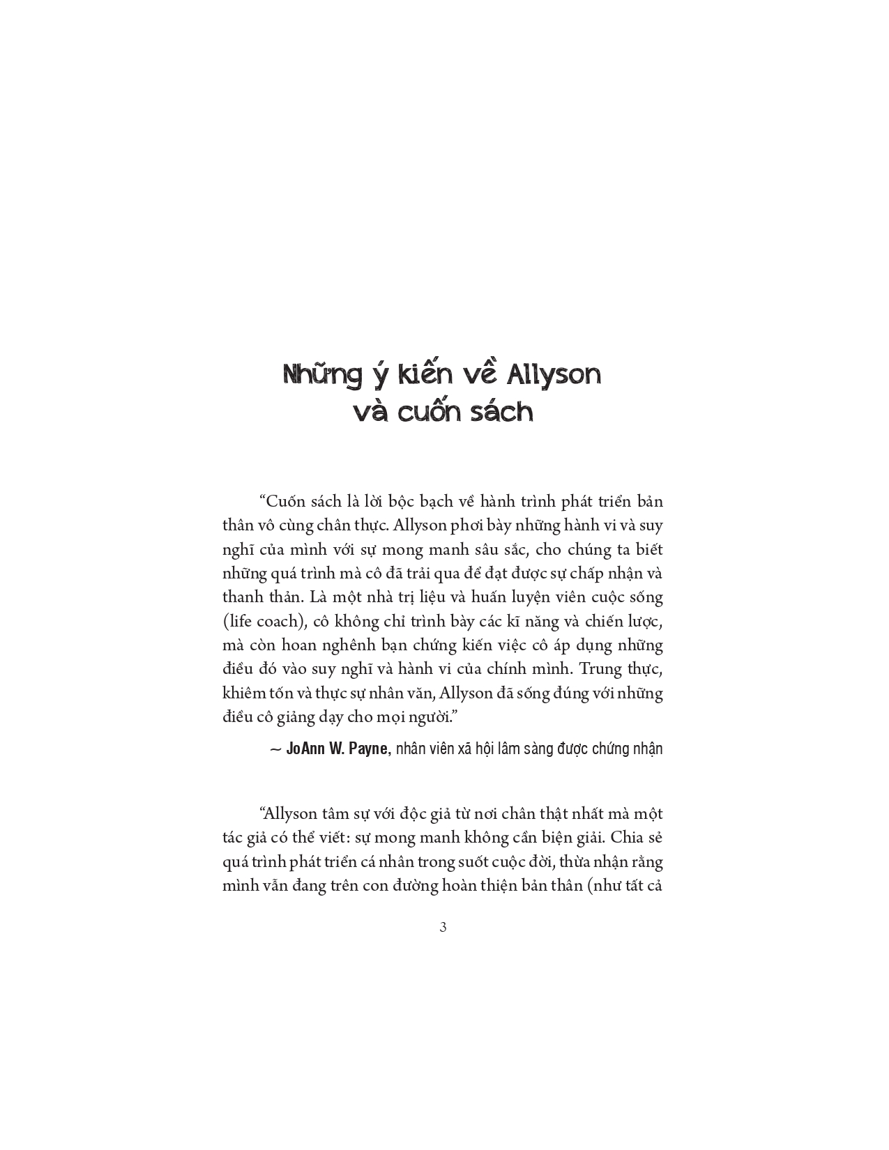 Cuốn sách là món quà tri thức, sự thấu hiểu và các công cụ để giúp bạn chịu trách nhiệm hoàn toàn cho cuộc sống của mình. Cuốn sách là một hành trình nội tâm của công cuộc khám phá bản thân, sự trung thực và trách nhiệm cá nhân, để soi sáng những góc sâu kín nhất của cảm xúc, suy nghĩ, niềm tin, nhu cầu, thói quen, và khuôn mẫu hành động của bạn.