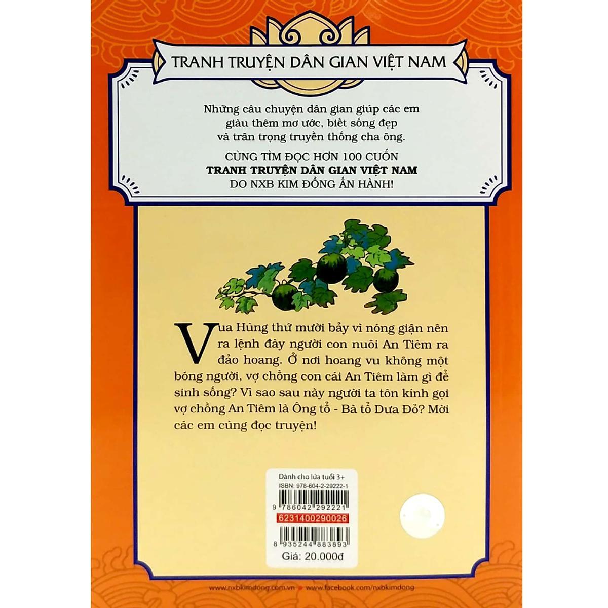 Giới thiệu sách Những câu chuyện dân gian giúp các em giàu thêm mơ ước, biết sống đẹp và trân trọng truyền thống cha ông. Tóm tắt nội dung Vua Hùng thứ mười bảy vì nóng giận nên ra lệnh đày người con nuôi An Tiêm ra đảo hoang. Ở nơi hoang vu không một bóng người, vợ chồng con cái An Tiêm làm gì để sinh sống? Vì sao sau này người ta tôn kính gọi vợ chồng An Tiêm là Ông tổ - Bà tổ Dưa Đỏ? Mời các em cùng đọc truyện!