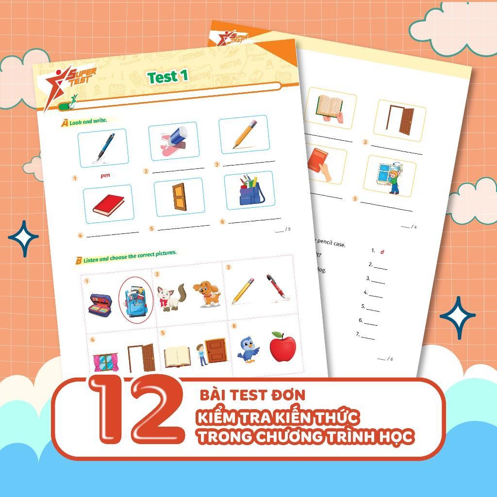 Với Bộ sách Super Test – Đề kiểm tra nhanh Tiếng Anh cho học sinh, bố mẹ sẽ giúp con tiến bộ từng ngày, tự tin với khả năng ngôn ngữ của mình khi ôn luyện Tiếng Anh bởi các bài tập về 4 kỹ năng: Nghe – Nói – Đọc – Viết được liên kết với nhau theo logic của bài học.