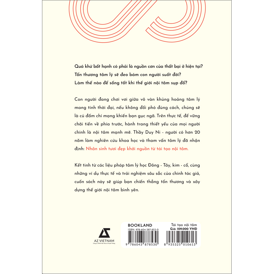 Thầy Duy Ni - người có hơn 20 năm làm nghiên cứu khoa học và tham vấn tâm lý đã nhận định: “Nhân sinh tươi đẹp khởi nguồn từ tái tạo nội tâm.” Cuốn sách này là kết tinh của các liệu pháp tâm lý học Đông - Tây, kim - cổ, cùng những ví dụ thực tế và trải nghiệm sâu sắc của chính tác giả. Nó sẽ giúp người đọc có cái nhìn chính xác và giải pháp thực tế để đối phó với các vấn đề tâm lý thường gặp như: lo lắng, sợ hãi, trầm cảm, ám ảnh cưỡng chế, Đây là một công cụ chắc chắn cần thiết để chiến thắng tổn thương và xây dựng thế giới nội tâm bình yên