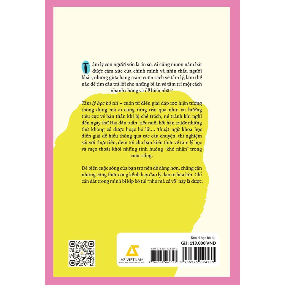 Tâm lý học bỏ túi – cuốn từ điển giải đáp 100 hiện tượng thông dụng mà ai cũng từng trải qua như: xu hướng tiêu cực về bản thân khi bị chê trách, né tránh khi nghĩ đến ngày thứ Hai đầu tuần, tiếc nuối hối hận trước những thứ không có được hoặc bỏ lỡ,...