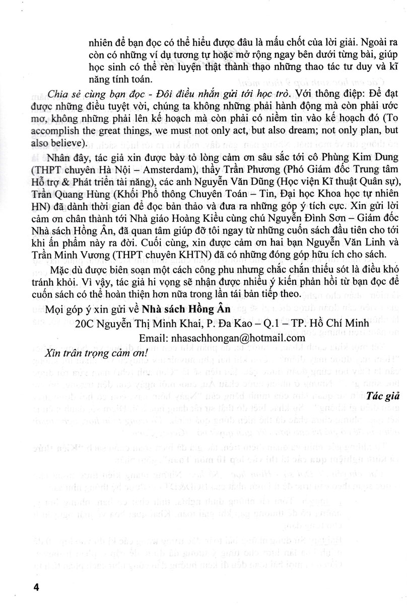 Xét một khía cạnh khác, ở nước ta, đa phần khi con mình đi học về, bố mẹ sẽ hỏi “Hôm nay được mấy điểm?”. Còn khi hai phụ huynh nói chuyện với nhau thì không cần là thầy bói cũng đoán được câu đầu tiên sẽ là “Con anh (chị) năm vừa rồi được học sinh gì ?”. Nhưng ở nhiều nước châu Âu, cuối mỗi ngày con đến trường, bố mẹ lại thể hiện sự quan tâm của mình bằng câu “Ngày hôm nay, con có hỏi được thầy giáo điều gì không?”. Sự khác biệt đó thật sự rất đáng học hỏi. Điểm số, danh hiệu là kết quả, nhưng chưa chắc đã thể hiện đúng quá trình. “Và trong toán học, nghệ thuật nêu vấn đề có giá trị cao hơn việc giải quyết nó” (Georg Cantor). Từ những góc nhìn và quan điểm trên, tác giả đã biên soạn cuốn sách Kiến Thức Và Kinh Nghiệm Làm Bài Qua Các Kì Thi Vào Lớp 10 Môn Toán, gồm phần: