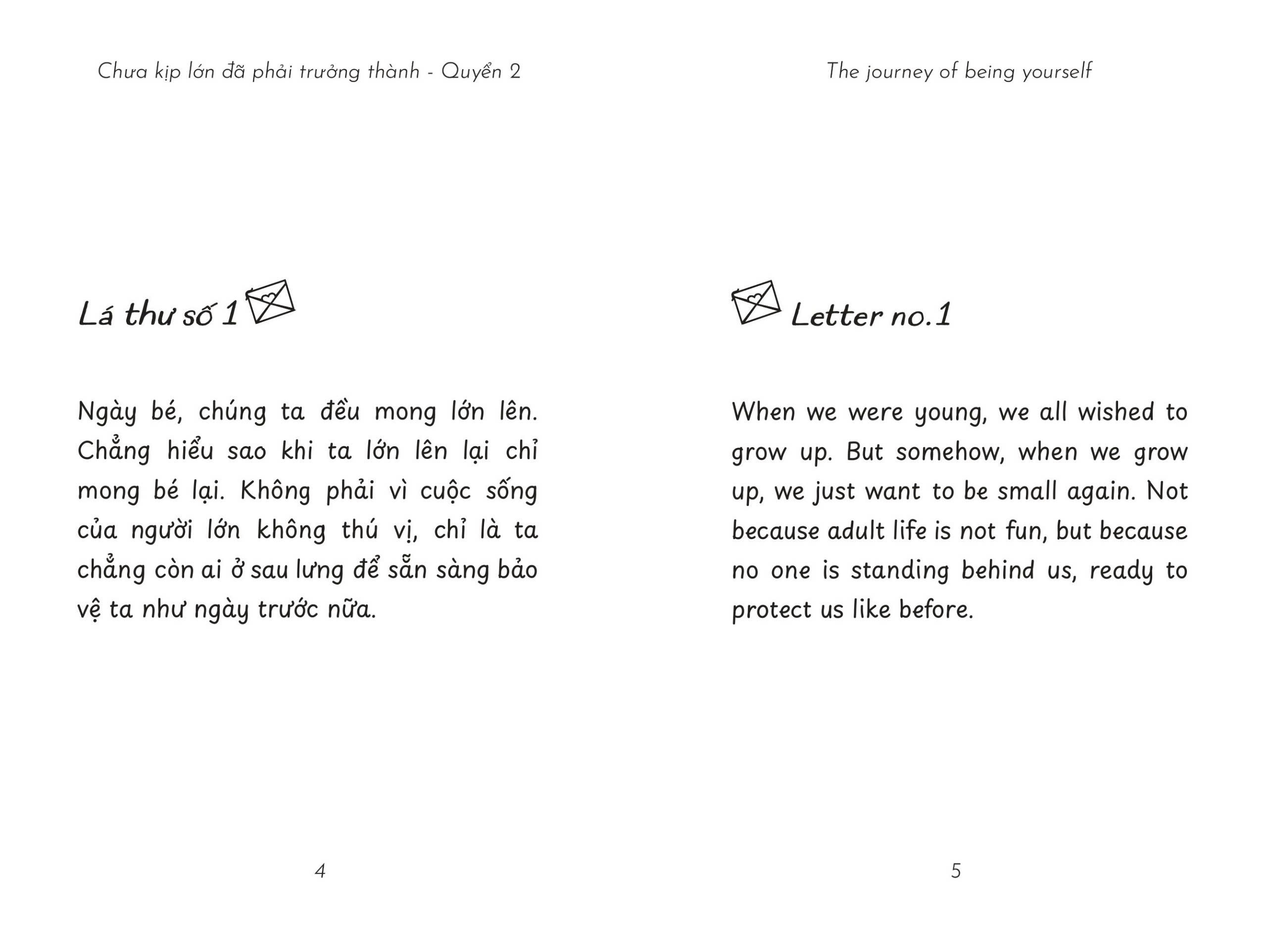 Cuốn sách là những lá thư tâm tình nhẹ nhàng được viết bằng 2 ngôn ngữ Việt - Anh sẽ nhắn nhủ bạn về sự đặc biệt của bản thân, tiếp thêm niềm tin để bạn không ngừng hoàn thiện trong thế giới người lớn, đồng thời nâng cao năng lực ngoại ngữ để chinh phục