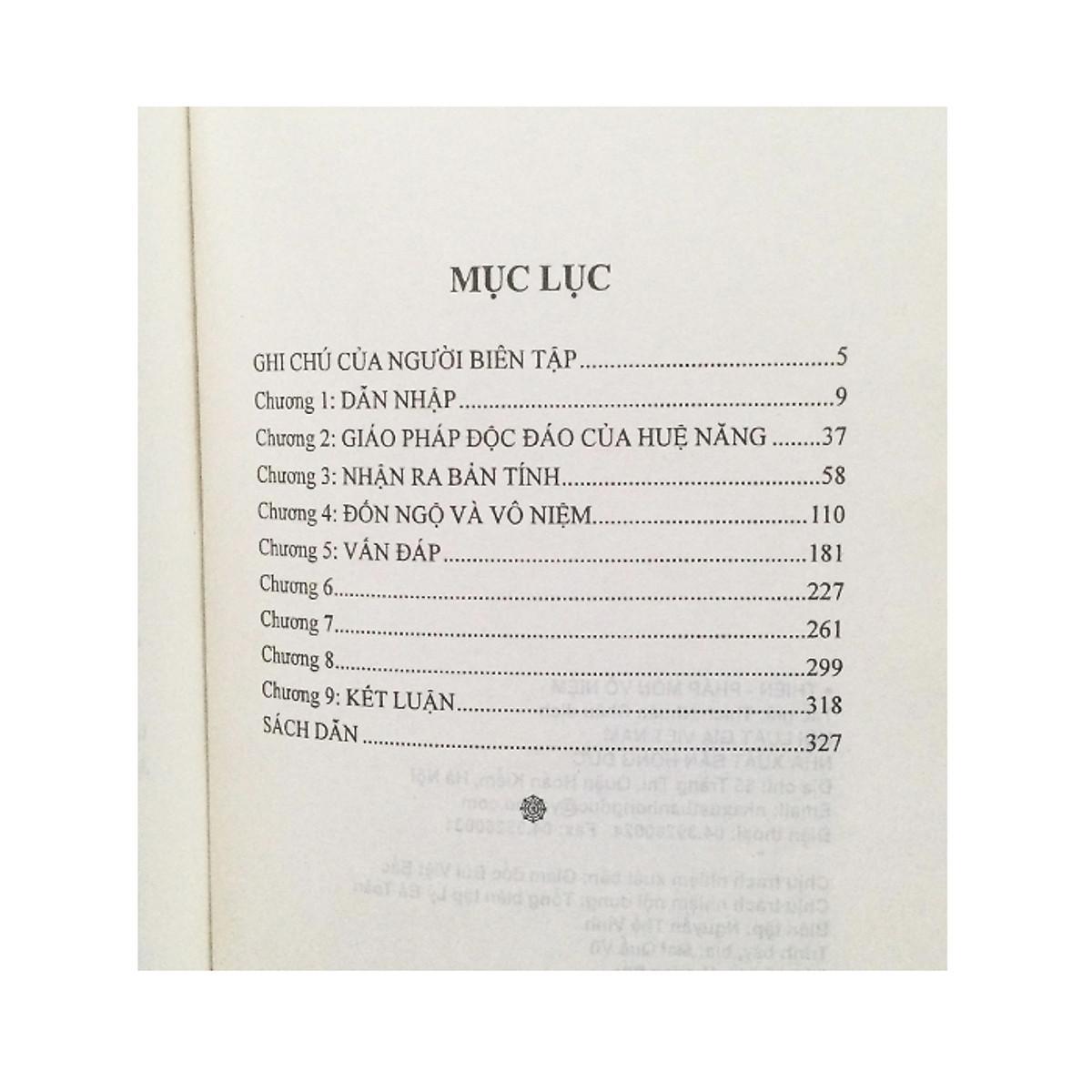 Cuốn sách này đề cập một cách chuyên biệt và rộng rãi về giáo lý của Huệ Năng, bao gồm toàn bộ mục tiêu, kỹ thuật của phép tu Thiền với ý nguyện mong mỏi nhiều người sẽ tiến sâu hơn vào tinh thần Thiền hơn bất kỳ việc gì khác trong thời hiện đại. CHRISTMAS HUMPHREYS (Nguyên Chủ Tịch Hội Phật Giáo Luân Đôn)