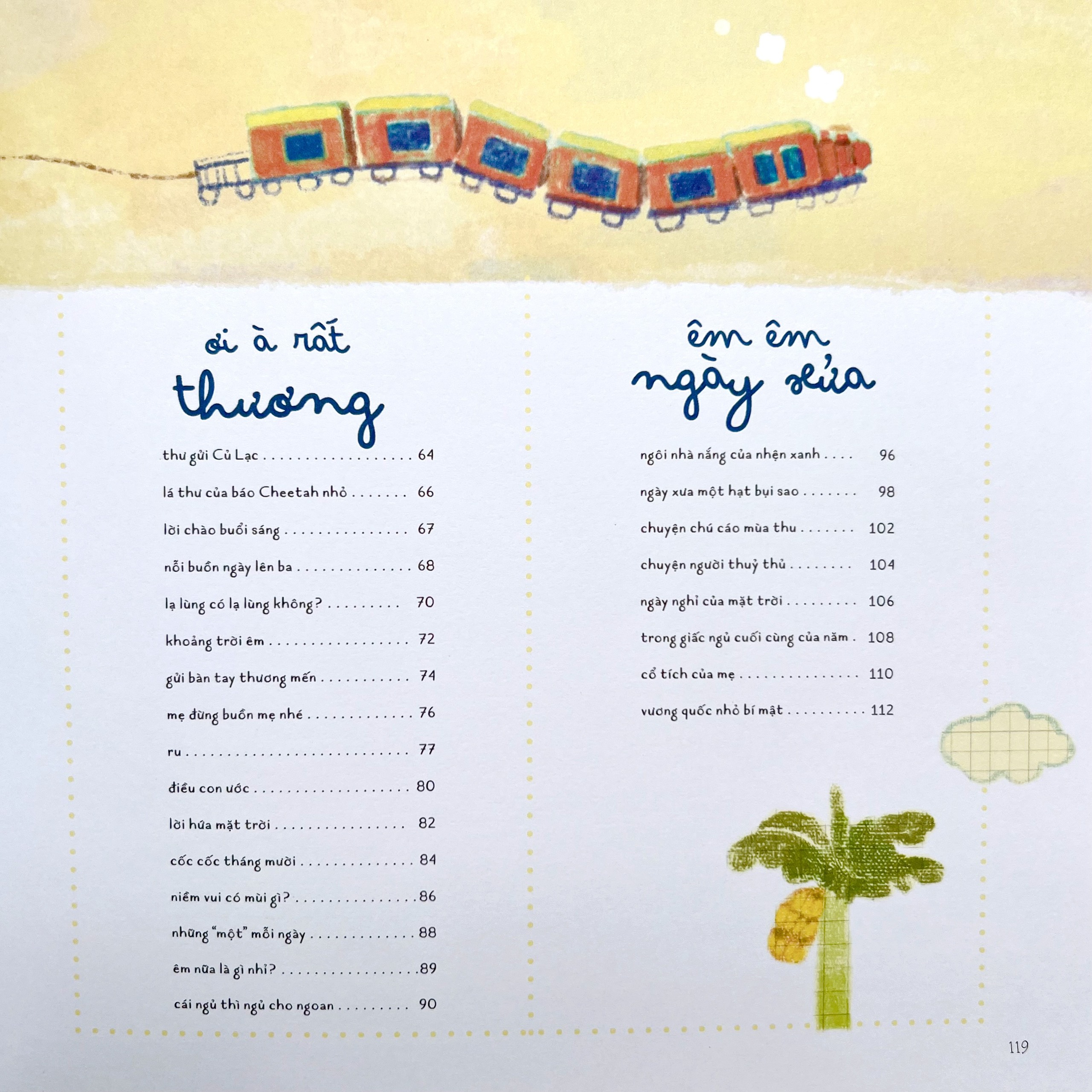 4 chủ đề bao khắp tập thơ gần gũi với trẻ thơ và những tâm hồn còn thơ bé: “ôi chà rất xanh” - những khoảnh khắc an yên mà thiên nhiên trao tặng, “ơ kìa rất vui” - những niềm vui nhỏ bé khiến mình nhoẻn miệng cười mãi thôi, “à ơi rất thương” - một dải cảm xúc nhiều cung bậc và “êm êm ngày xưa” - những mẩu ký ức tuổi thơ êm đềm.