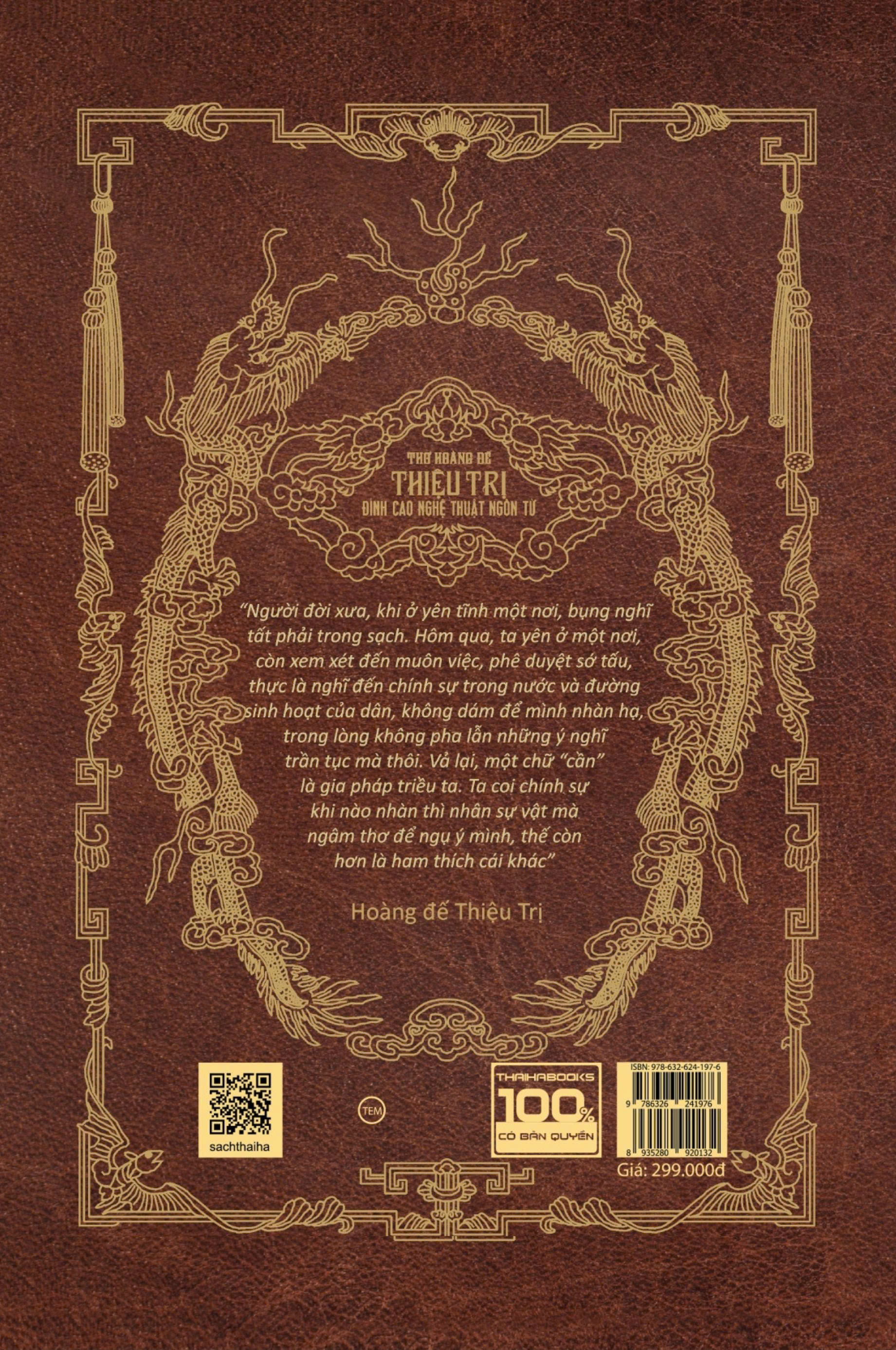 Tên sách Thơ Hoàng đế Thiệu Trị Tác giả Nguyễn Phước Hải Trung Hình thức Bìa cứng, tay gấp Số trang 432 trang Nhà xuất bản Văn học Khổ 16x24cm Barcode - ISBN 8935280920132 - 9786326241976 THƠ HOÀNG ĐẾ THIỆU TRỊ - ĐỈNH CAO NGHỆ THUẬT NGÔN TỪ Tác giả: Nguyễn Phước Hải Trung Cuốn sách viết về thơ của Hoàng đế Thiệu Trị cũng như quan niệm của ông về thi ca, tất cả đều gắn với lý tưởng thời đại. Ông không chỉ sáng tác bằng nhiều thể thơ nhất Việt Nam mà còn là nhà sáng tạo thể cách thi ca. Ông cũng là một Nhà lý luận, nghiên cứu văn chương. Đọc nhiều trang sử liệu có thể thấy ông không chỉ một nhà thơ mà còn là nhà lý luận phê bình, nghiên cứu văn học với tư duy sâu sắc qua hàng loạt phát biểu về thơ của mình. Thơ đối với Thiệu Trị không đơn thuần là nghệ thuật, càng không phải là thú tiêu dao của bậc đế vương rảnh rỗi, mà là phương tiện biểu đạt đạo lý và chính hóa. Quan điểm thơ ca của ông thể hiện qua nhiều phương diện: từ lý tưởng đạo Nho đến thực tiễn phê bình văn học, từ tinh thần trọng học vấn đến thái độ duy lý với văn chương cổ truyền. Những tư tưởng này cho thấy Thiệu Trị là một nhà thơ mang tầm vóc của học giả, không chỉ viết thơ mà còn nghĩ về thơ, bình xét về thơ, và giảng giải thi pháp như một học giả thực thụ. Cách đây 23 năm, tác giả Nguyễn Phước Hải Trung có xuất bản cuốn sách nghiên cứu viết riêng đầu tay của ông với tựa đề “Chơi chữ Hán Nôm - những bài thơ độc đáo”.Ông choáng ngợp với những sáng tạo chữ nghĩa của cổ nhân. Đến khi thủ đắc một bộ thơ chữ Hán “Ngự chế thi tập” (từ sơ tập đến tứ tập với 5000 trang) đầy đủ của hoàng đế Thiệu Trị mới càng “hoang mang” vì số lượng “những bài thơ độc đáo” (như cách nói trước đây của tôi) ở tập này quá nhiều, khiến người đọc không khỏi đi từ ngạc nhiên này sang ngạc nhiên khác. Khi rảng rỗi, tác giả bắt đầu tìm hiểu nội dung cụ thể của những bài thơ “dị thường” trong tập thơ này, tìm hiểu về “chân dung thơ” vua Thiệu Trị một cách toàn diện mới thấy rõ, hoàng đế là một tác giả cực kỳ đặc biệt của “làng văn học trung đại”.
