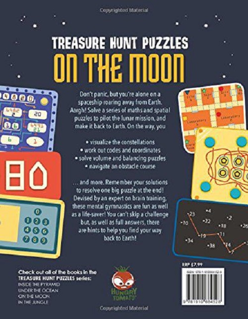 On the Moon is one of four books in our Treasure Hunt Puzzles series. You’re on a tour of a space research facility and board an experimental spaceship that accidentally launches. You’re on your own flying to the Moon! This is a special kind of book. It contains a story with lots of puzzles that lead you on an adventure. You must land on the Moon and return to Earth – all by working out codes and coordinates, solving maths and spatial puzzles, and much more. Plus, remember your answers to unlock one final puzzle for a safe touchdown!