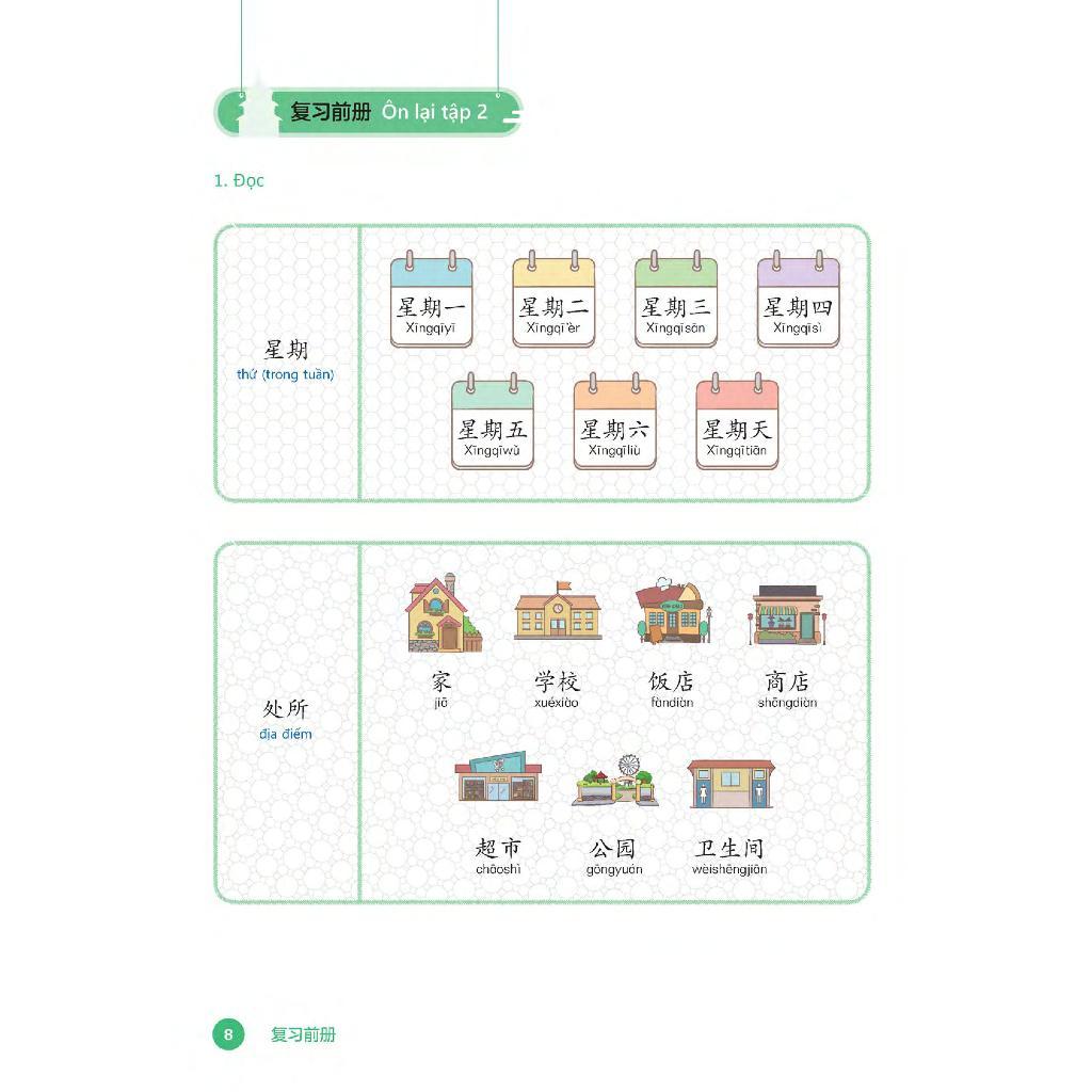 Giáo trình tiếng Trung dành cho học sinh tiểu học – Sách bài học – Tập 2 bao gồm 12 bài học. Sau ba bài học sẽ có một bài ôn tập. Sách có sử dụng các từ vựng và mẫu câu quan trọng trong giáo trình Tiếng Trung dành cho học sinh tiểu học – Sách bài học – Tập 1 để học sinh có thể ôn lại bài cũ trong bài học mới. Phần đầu sách có mục “Những cách diễn đạt thường gặp trong lớp học”, tiếp theo là bài giới thiệu sơ lược về chữ Hán. Bài giới thiệu này sẽ giúp học sinh hiểu toàn diện về chữ Hán và có nền tảng vững chắc để học chữ Hán về sau. Cuối sách là “Bảng từ vựng”, “Bảng chữ Hán để đọc và nhận biết”, “Bảng chữ Hán để viết và nhận biết”.