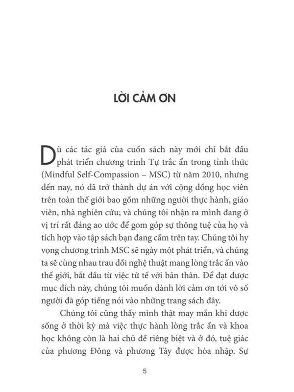 Trắc ẩn với chính mình là cuốn sách dựa trên cơ sở khoa học, bao gồm các bài thiền có hướng dẫn; tập quán thức có thể thực hiện mọi lúc, mọi nơi. Qua đó bạn sẽ biết cách thoát khỏi những phán xét gay gắt về bản thân và những tiêu chuẩn bất khả thi, nhằm giải quyết căng thẳng trong mối quan hệ cũng như các vấn đề thể chất lẫn tinh thần khác để nuôi dưỡng cảm giác hạnh phúc.