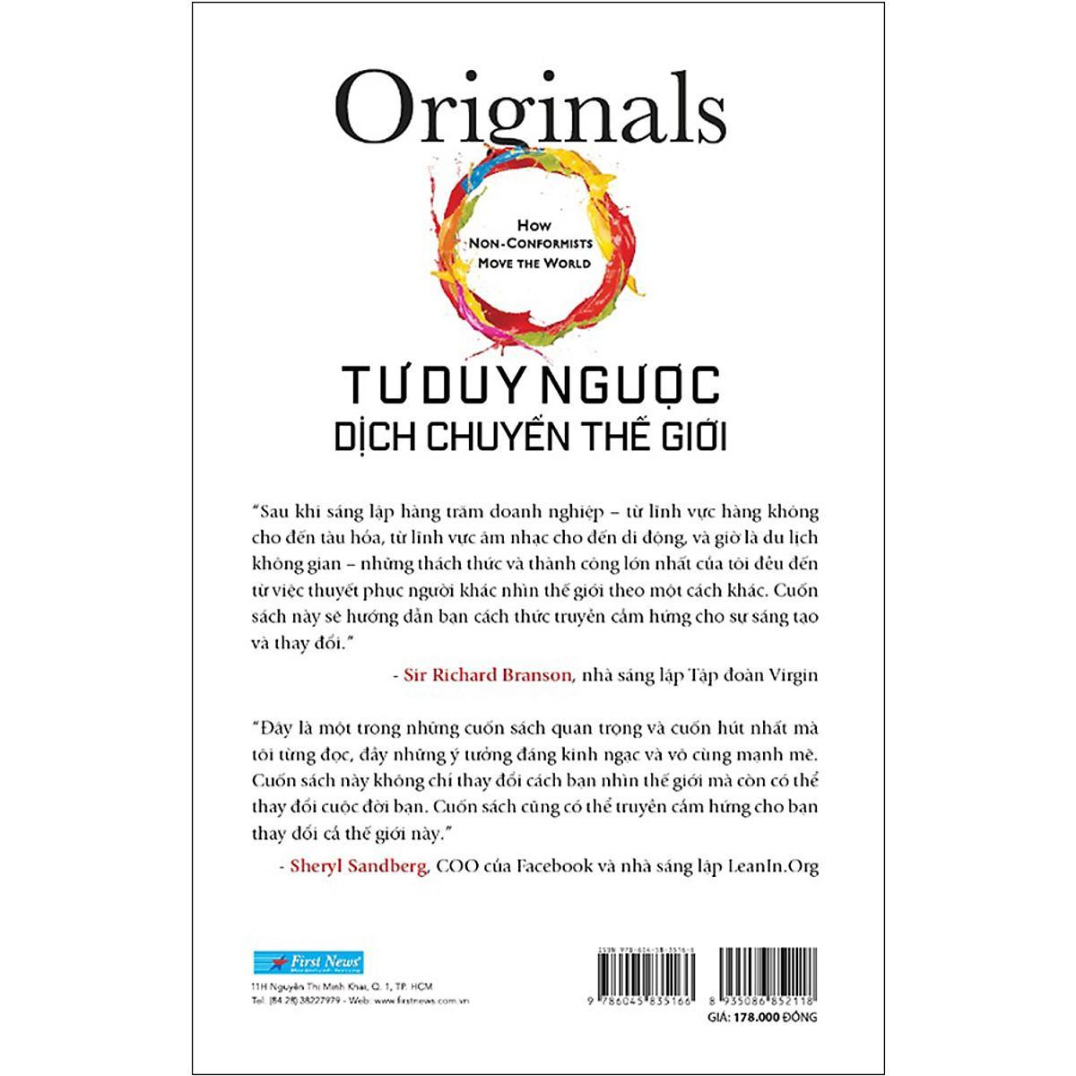 TƯ DUY NGƯỢC DỊCH CHUYỂN THẾ GIỚI Adam Grant là tác giả cuốn Give and take (tựa tiếng Việt là “Cho và nhận), tác phẩm được The New York Times bình chọn là sách bán chạy nhất. Trong Give and take, Adam đã chỉ cho mọi người cách thức để bảo vệ thành công những ý tưởng mới, cũng như phương pháp để các nhà lãnh đạo có thể khuyến khích sự đa dạng và khác biệt trong suy nghĩ và hành động của tổ chức mình. Với Tư duy ngược dịch chuyển thế giới, một lần nữa, Adam Grant lại giải quyết vấn đề làm sao để cải thiện thế giới, nhưng từ góc nhìn mới “trở nên khác biệt”: Chọn đi “ngược dòng”, đấu tranh với tính tuân thủ cứng nhắc và đập tan các truyền thống lỗi thời. Làm sao chúng ta có thể hình thành những ý tưởng, chính sách và thực hành mới mà không phải mạo hiểm một cách mù quáng? Qua những nghiên cứu và câu chuyện đáng kinh ngạc trong lĩnh vực kinh doanh, chính trị, thể thao và giải trí, Grant đã khám phá ra phương pháp để nhận biết một ý tưởng hay, cách lên tiếng mà không bị cô lập, xây dựng liên minh, chọn thời điểm thích hợp để hành động, kiểm soát nỗi sợ hãi và nghi ngờ; cũng như cách thức để các bậc phụ huynh và giáo viên có thể nuôi dưỡng khả năng sáng tạo độc đáo ở trẻ; và giải pháp để các nhà lãnh đạo đấu tranh với tư duy “bầy đàn”. Ngoài ra, độc giả còn có thể học hỏi được kinh nghiệm của một nhà khởi nghiệp gọi vốn bằng cách nhấn mạnh những lý do mà các nhà đầu tư không nên đầu tư. Chẳng hạn một nữ quản lý dưới Steve Jobs ba bậc đã thách thức ông ấy như thế nào, một nhà phân tích ra tay lật ngược quy tắc bảo mật tại CIA, một ông trùm tài chính nắm trong tay hàng tỷ đô-la đã sa thải những nhân viên nào không dám chỉ trích ông, và một giám đốc truyền hình thậm chí còn chẳng biết gì về hài kịch nhưng đã cứu chương trình Seinfeld ra khỏi phòng kiểm duyệt. Phần thưởng của họ là tập hợp những quan niệm và nhận thức đột phá khi từ chối tuân thủ các khuôn mẫu sẵn có và luôn tìm cách cải thiện nguyên trạng. Tư duy ngược dịch chuyển thế giới được COO của Sheryl Sandberg, tỷ phú sáng tạo Richard Branson, tác giả kỳ cựu Malcome Gladwell và nhiều nhà lãnh đạo hàng đầu thế giới đánh giá cao. COO của nhận xét: “Đây là một trong những cuốn sách quan trọng và cuốn hút nhất mà tôi từng đọc, đầy những ý tưởng đáng kinh ngạc và vô cùng mạnh mẽ. Cuốn sách này không chỉ thay đổi cách bạn nhìn thế giới mà còn có thể thay đổi cuộc đời bạn. Cuốn sách cũng có thể truyền cảm hứng cho bạn thay đổi cả thế giới này”. Về tác giả Adam Grant được công nhận là giáo sư hàng đầu trong bốn năm liền của Đại học Wharton, một trong những nhà tư tưởng quốc tế có tầm ảnh hưởng lớn nhất theo tạp chí HR, và nằm trong danh sách 40 giáo sư kinh doanh dưới 40 tuổi tài giỏi nhất thế giới. Cuốn sách đầu tay của Adam Grant, Give and Take (Cho và nhận), là tác phẩm bán chạy nhất theo đánh giá của The New York Times và đã được dịch sang hơn 27 ngôn ngữ. Đồng thời, Give and Take cũng góp mặt trong danh sách những cuốn sách hay nhất năm 2013 của , Financial Times và Wall Street Journal; Give and Take được Oprah xem là một trong những cuốn sách hấp dẫn nhất và là một trong những ý tưởng làm sắc nét ngành quản trị, theo Harvard Business Grant cũng từng diễn thuyết và tư vấn cho nhiều khách hàng, trong đó có , Goldman Sachs, Disney Pixar, Liên Hợp Quốc,…Ông có bằng tiến sĩ của Đại học Michigan và bằng cử nhân của Đại học Harvard.