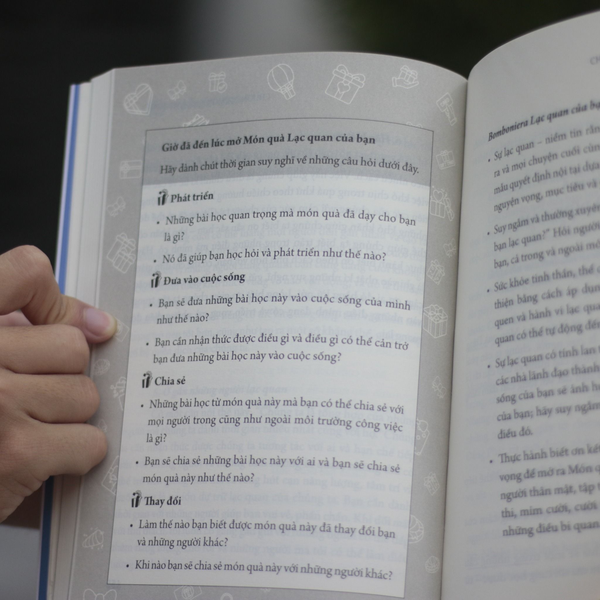 - Có gì trong cuốn sách Tư Duy Quà Tặng? Áp dụng Tư Duy Quà Tặng sẽ giúp bạn đón nhận thử thách và thành công với niềm vui cả trong lẫn ngoài nơi làm việc. Chia sẻ những bài học ta đúc rút được thông qua các món quà không chỉ tiếp thêm sức mạnh cho ta, mà còn có thể trở thành cẩm nang sinh tồn của người khác và giúp tạo ra một văn hóa chia sẻ, cởi mở. Phần I của cuốn sách sẽ giúp bạn nắm bắt khái niệm Tư Duy Quà Tặng. Trong phần II, ta sẽ khám phá 12 món quà: Món quà lạc quan, dũng cảm, kiên cường, biết ơn, tò mò, thay đổ Bạn có thể đọc về những món quà này theo bất kì trình tự nào, tùy thuộc vào nhu cầu của bạn và điều quan trọng đối với bạn tại thời điểm đọc. Một cuốn sách sẽ sống đúng với mục đích của nó khi bị quăn mép, đánh dấu và cũ sờn; cuốn sách này hứa hẹn sẽ trở thành một nguồn tài liệu quý báu và một món quà mang lại giá trị lâu dài trong việc phát triển và thay đổi văn hóa trong các tổ chức và sự kết nối. Đây là một cuốn sách đầy cảm hứng, hứa hẹn sẽ đồng hành cùng bạn trong việc thúc đẩy văn hóa lấy con người làm trung tâm, phát triển khả năng lãnh đạo, tạo động lực cho mọi người để phát huy tối đa khả năng làm việc của mình, mang đến hiệu quả một cách tốt nhất!