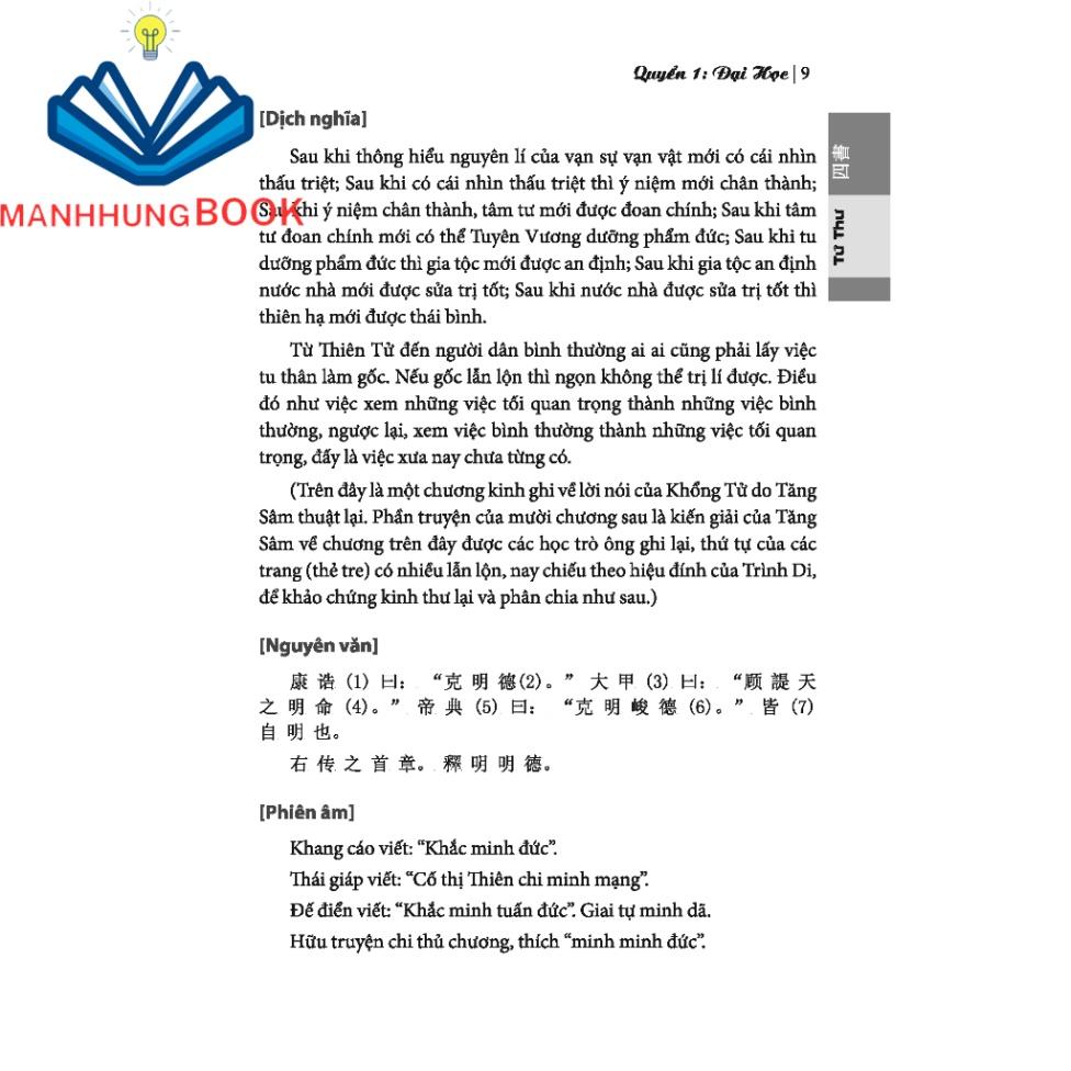 Bộ sách Tứ Thư là tổng hợp của bốn quyển sách, bao gồm: Đại Học, Trung Dung, Luận Ngữ, Mạnh Tử, được trình bày chi tiết qua những phần căn bản sau: