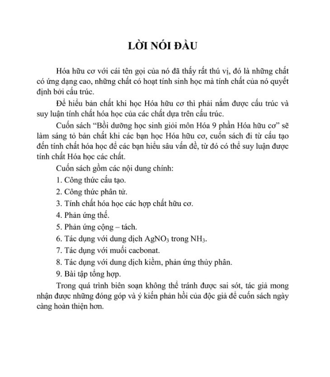 Cuốn sách" Bồi dưỡng học sinh giỏi Hóa học 9" sẽ làm sáng tỏ bản chất khi các bạn học hóa hữu cơ, cuốn sách đi từ cấu tạo đến tính chất hóa học để các bạn hiểu sâu vấn đề, từ đó suy luạn được tính chất hóa học các chất