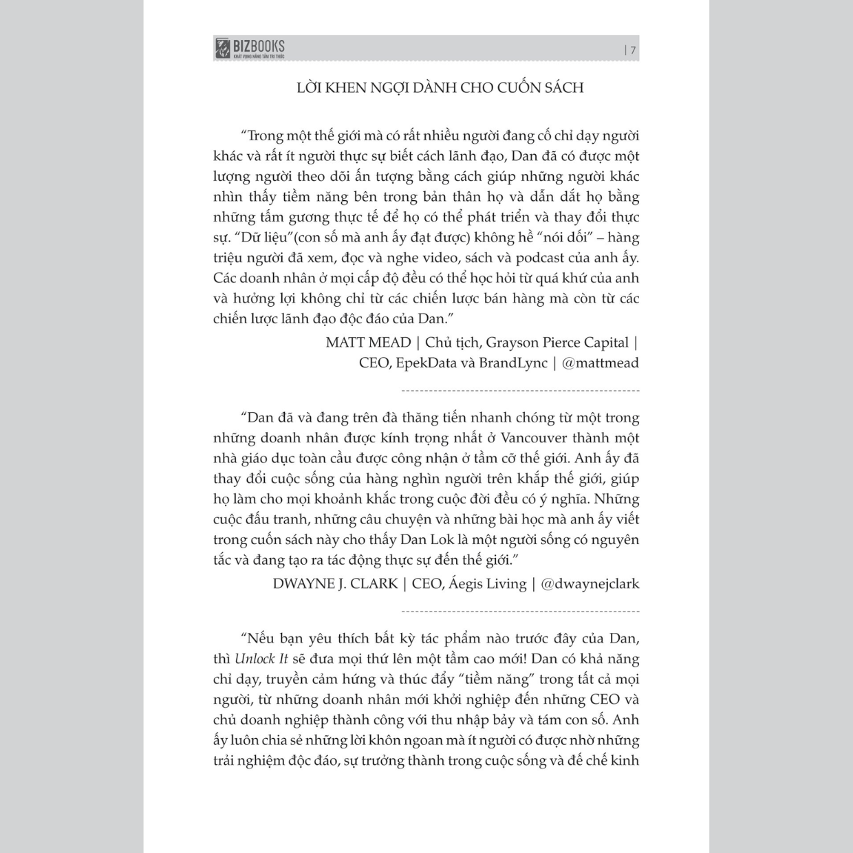 Tác giả chia sẻ những lời khôn ngoan mà ít người có được nhờ những trải nghiệm độc đáo, sự trưởng thành trong cuộc sống và đế chế kinh doanh thành công của anh ấy. Cho dù bạn là nhà tiếp thị, người mới khởi nghiệp, doanh nhân, triệu phú hay hiện tại là kẻ vô công rồi nghề, thì Unlock It đề sẽ đem lại cho bạn những kiến thức vô giá, hệ thống và khả năng “mở khóa” tiềm năng thực sự của bạn.