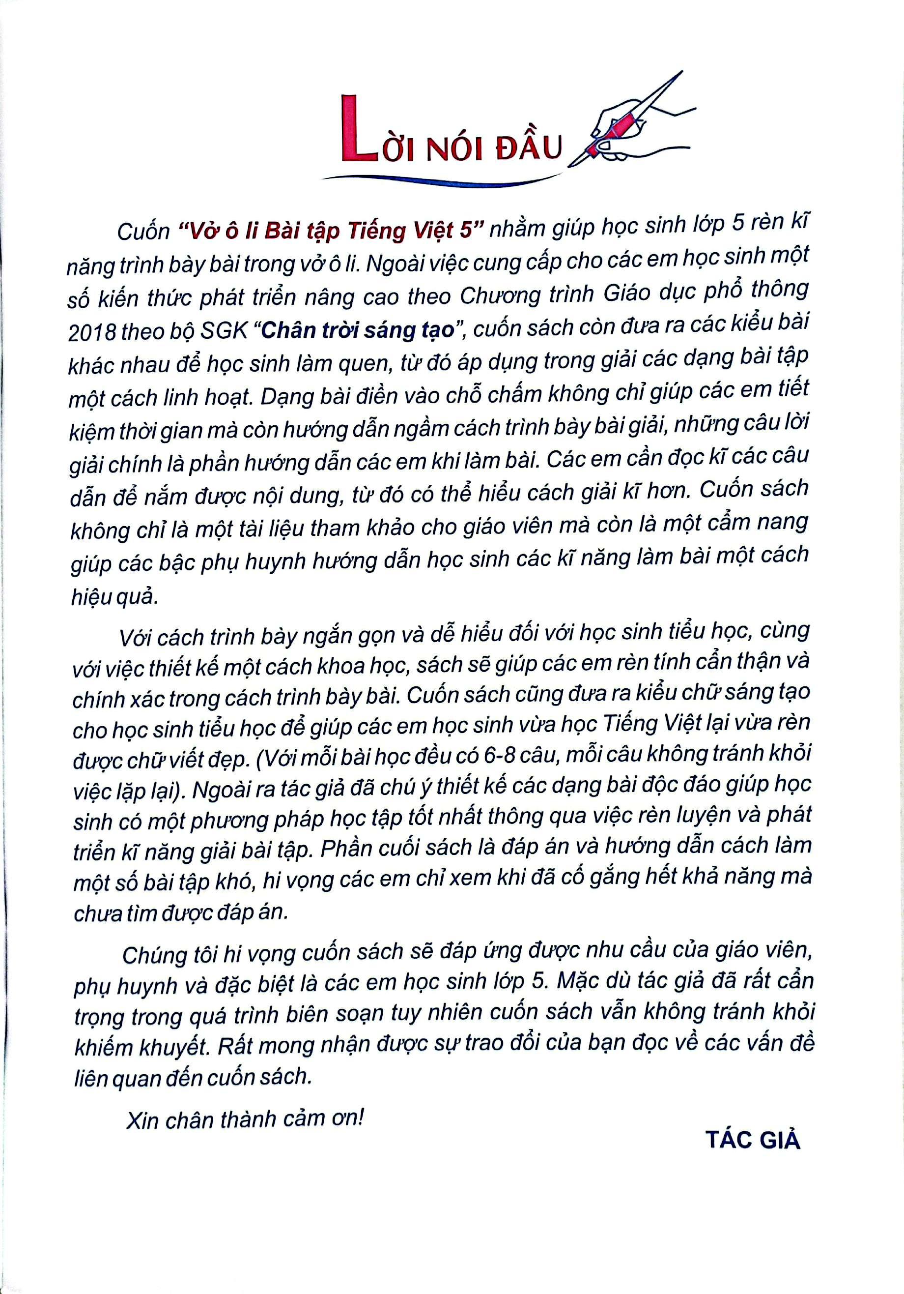 Cuốn “Vở ô li Bài tập Tiếng Việt 5” nhằm giúp học sinh lớp 5 rèn kĩ năng trình bày bài trong vở ô li. Ngoài việc cung cấp cho các em học sinh một số kiến thức phát triển nâng cao theo Chương trình Giáo dục phổ thông 2018 theo bộ SGK “Chân trời sáng tạo”, cuốn sách còn đưa ra các kiểu bài khác nhau để học sinh làm quen, từ đó áp dụng trong giải các dạng bài tập một cách linh hoạt. Dạng bài điền vào chỗ chấm không chỉ giúp các em tiết kiệm thời gian mà còn hướng dẫn ngầm cách trình bày bài giải, những câu lời giải chính là phần hướng dẫn các em khi làm bài. Các em cần đọc kĩ các câu dẫn để nắm được nội dung, từ đó có thể hiểu cách giải kĩ hơn. Cuốn sách không chỉ là một tài liệu tham khảo cho giáo viên mà còn là một cẩm nang giúp các bậc phụ huynh hướng dẫn học sinh các kĩ năng làm bài một cách hiệu quả.