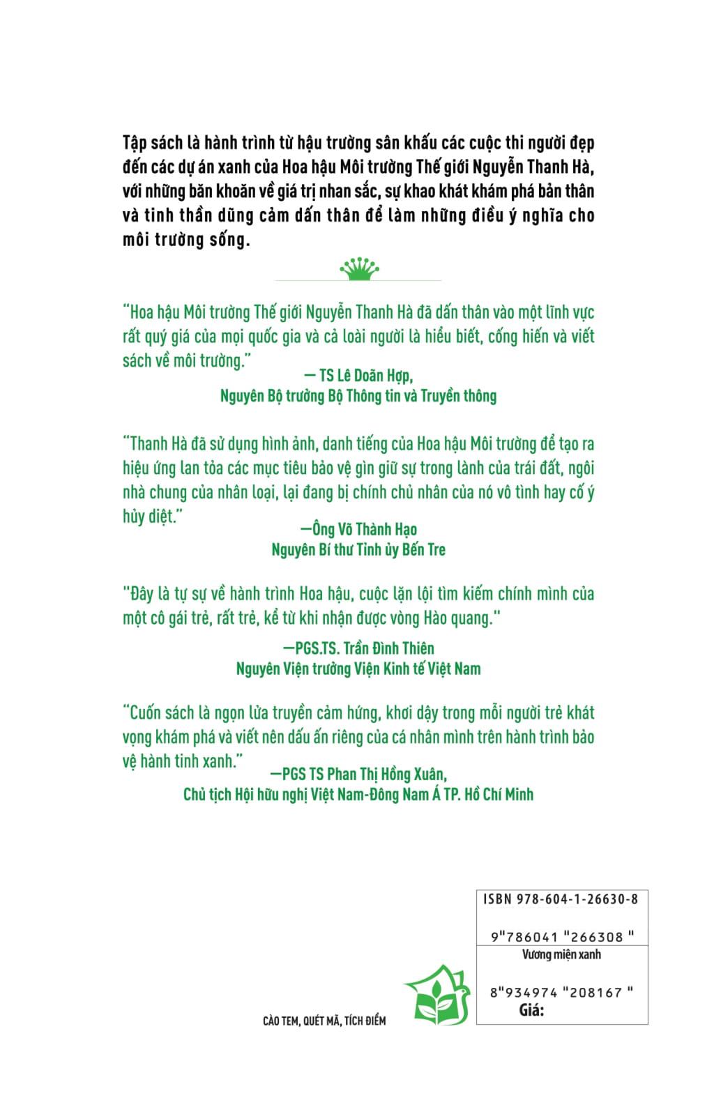 Trong sách có những giọt mồ hôi trên đường tới vinh quang, có nỗi sợ hãi trước sự tấn công vào hình thể và phẩm giá,… và quá trình Thanh Hà vượt lên tất cả để làm tròn sứ mệnh của m.ình. Đó là những trang viết của nhan sắc, lòng dũng cảm và khao khát khám phá bản thân để làm những điều nhỏ bé nhưng ý nghĩa cho môi trường sống của chúng ta.