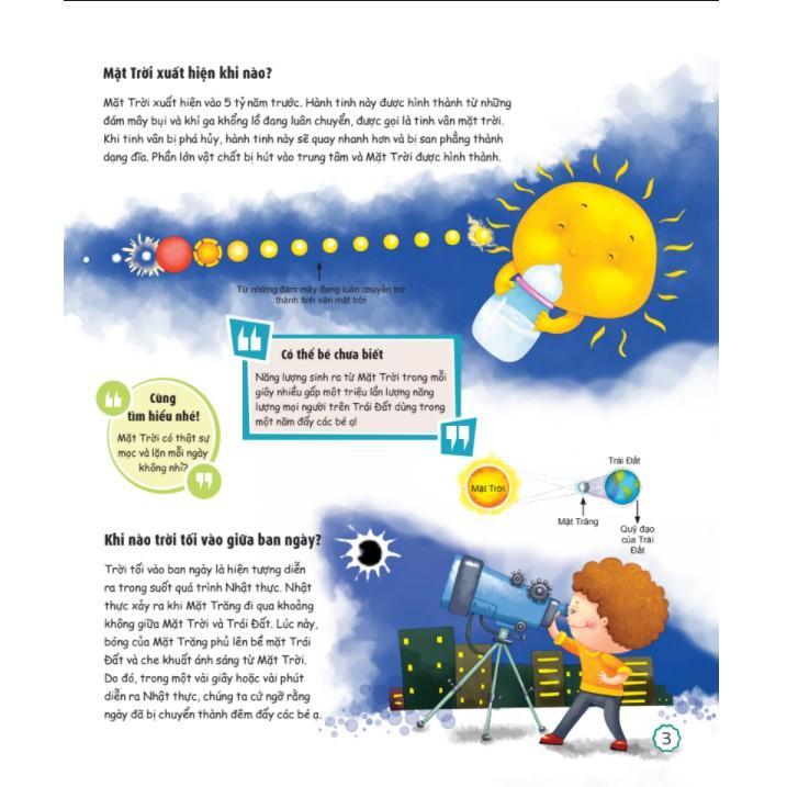 - 6 chương của cuốn sách sẽ mở ra những điều thú vị và trả lười những thắc mắc của con về: Cơ thể người, hệ mặt trời, công nghệ, khoa học, động vật, tự nhiên.