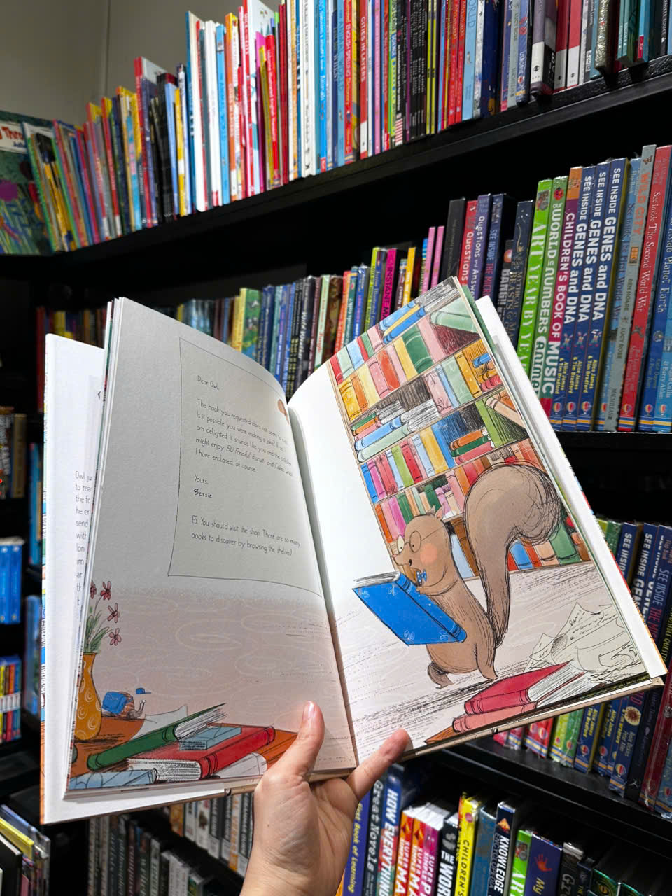Owl chỉ muốn có chút yên tĩnh để đọc sách một mình. Nhưng khi những đứa trẻ trong rừng làm anh ta khó chịu, anh ta nhờ chủ hiệu sách địa phương gửi cho anh ta những cuốn sách được chọn lọc kỹ lưỡng để giúp anh ta đối phó với sự hỗn loạn và lộn xộn. Không lâu sau, Owl phát hiện ra Squirrel và biết rằng tình bạn và cộng đồng cũng quan trọng như sự cô đơn. Được kể hoàn toàn bằng chữ cái, cuốn sách tranh quyến rũ này tôn vinh sách và hiệu sách, viết thư và tình yêu.