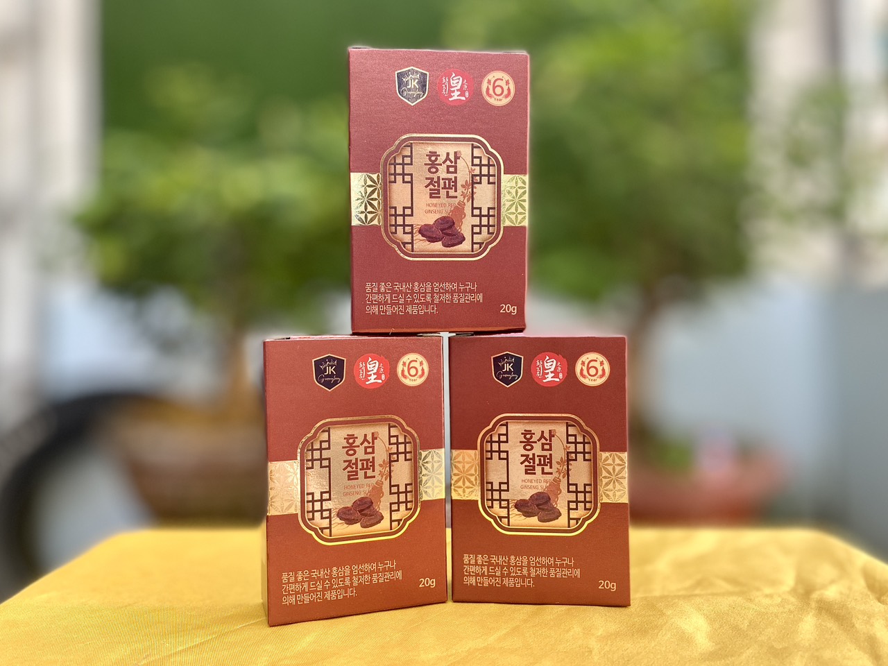 Mua tại TiktokSâm lát tẩm mật ong HG Bio Thương hiệu: HG Bio Nước sản xuất: Hàn Quốc Dòng sản phẩm: Sâm lát nguyên chất tẩm mật ong Đóng gói: 20g x 10gói/hộp ️Thành phần gồm có: hồng sâm Hàn Quốc 6 năm tuổi và mật ong nguyên chất CÔNG DỤNG: ️ Giúp bồi bổ , tăng sức đề kháng và thể trạng nhanh chóng ️Ngăn ngừa, ngăn chặn các loại bệnh ️Giải độc gan HDSD: ️Mỗi ngày dùng 1-2 lần, mỗi lần 1 gói, không nên dùng vào buổi tối ️Sử dụng trực tiếp, nhai và nuốt cả bả Chúng tôi cam kết sản phẩm 100% từ Hàn Quốc