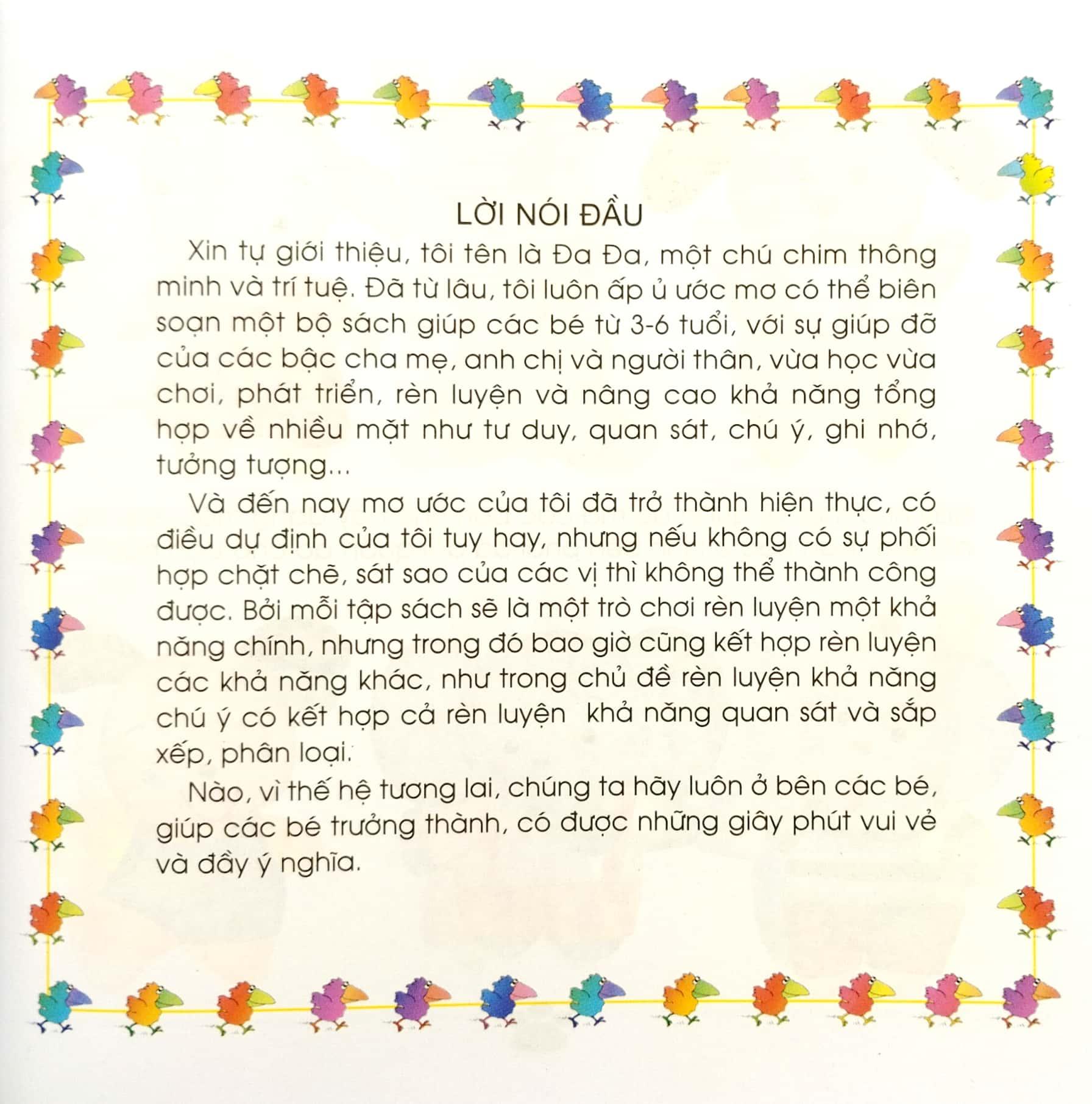 Và đến nay mơ ước của tôi đã thành hiện thực, có điều dự định của tôi tuy hay nhưng nếu không có sự phối hợp chặt chẽ, sát sao của các vị thì không thể thành công được. Bởi mỗi tập sách sẽ là một trò chơi rèn luyện một khả năng chính, nhưng trong đó bao giờ cũng kết hợp rèn luyện các khả năng khác, như trong chủ đề rèn luyện khả năng chú ý có kết hợp cả rèn luyện khả năng quan sát và sắp xếp, phân loại. Nào, vì thế hệ tương lai, chúng ta hãy luôn ở bên các bé, giúp các bé trưởng thành, có được những giây phút vui vẻ và đầy ý nghĩa.