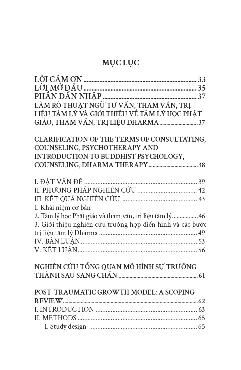 Cuốn sách được chia thành ba phần, có bố cục thứ tự như sau: Đầu tiên là phần dẫn nhập, trong đó những thuật ngữ “tư vấn, tham vấn, trị liệu tâm lý” và giới thiệu về tâm lý học phật giáo, trị liệu dharma được nêu rõ, cùng với “Nghiên cứu tổng quan mô hình sự trưởng thành sau sang chấn” đã mang đến một cái nhìn mới mẻ về việc vượt qua những tổn thương tâm lý. Từ những trải nghiệm đau thương, chúng ta được hướng dẫn đến sự thấu hiểu và chữa lành. Những khái niệm này cũng được trình bày trong rất nhiều những bài viết trong từng phần.