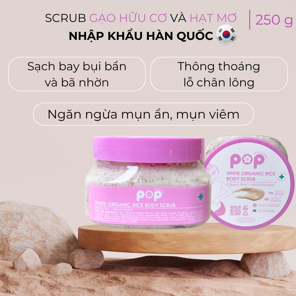 Tẩy Tế Bào Da Chết Gạo Hữu Cơ Sạch Sâu Sáng Mịn POP   Làn da của cơ thể chúng ta luôn có cơ chế tự nhiên nhiên là thay thế và phục hồi những tế bào mới liên tục. Tuy nhiên, do nhiều tác động xấu từ bên ngoài như thời tiết, môi trường hay thói quen chăm sóc da không tốt sẽ ảnh hưởng rất nhiều đến hoạt động của cơ chế này. Và nếu bạn không tẩy tế bào chết cho da thường xuyên mỗi tuần thì da sẽ rất khó hấp thụ được những dưỡng chất có trong các sản phẩm chăm sóc da và sẽ gây ra nguy cơ làm bít tắc lỗ chân lông đấy.Vì thế, việc tẩy tế bào da chết thường xuyên và điều đặn sẽ giúp da của bạn sản sinh tế bào da mới thường xuyên, để da luôn được căng bóng, sáng mịn và tràn đầy sức sống.    Tẩy tế bào da chết gạo hữu cơ POP rất giàu dưỡng chất từ thiên nhiên như chiết xuất trà xanh, rau má, lô hội, … không chỉ loại bỏ sạch những bụi bẩn, bã nhờn, tế bào da chết mà còn giúp cải thiện làn da của bạn từ sâu bên trong, mang lại làn da mịn màng, tươi sáng và săn chắc.   Loại bỏ triệt để tế bào da chết cứng đầu, mụn đầu đen, mụn cám. Làm sạch bụi bẩn và bã nhờn trên da, giúp thông thoáng lỗ chân lông, ngăn ngừa nguy cơ bị mụn ẩn, mụn viêm. Thúc đẩy sự phát triển, tái sinh của mô da, kích thích tăng sinh collagen, mang lại làn da hồng hào, săn chắc. Cân bằng độ ẩm của da, thành phần kháng viêm và chống ôxi hoá nguồn gốc tự nhiên bảo vệ da khỏi tác hại từ tia UV và môi trường xung quanh. Thành phần chính: