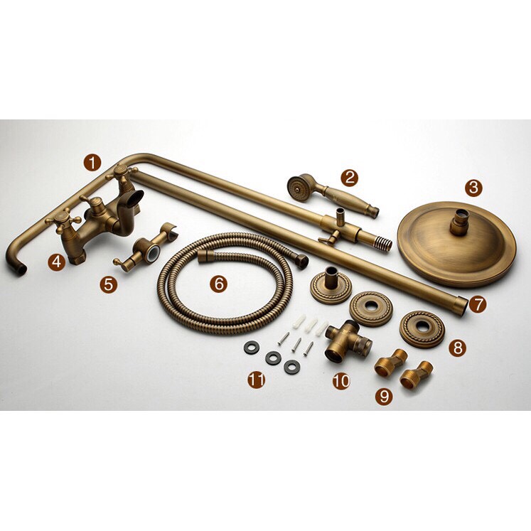 Combo gồm: 01 thân vòi sen lạnh, 01 chụp chân sen, 01 thân vòi lavabo, 01 dây cấp nước, 01 tay sen, 01 dây sen, 01 gác tay sen + ốc vít và tắc kê
