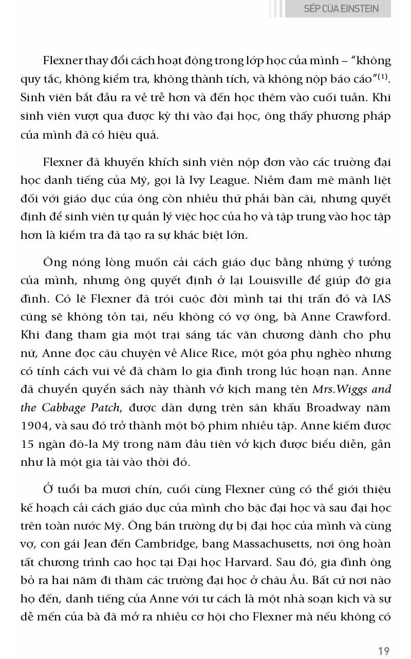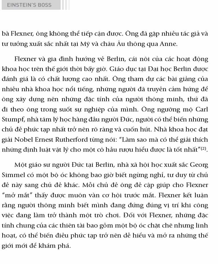 “Sếp của Einstein” kể những câu chuyện hấp dẫn về vai trò thầm lặng của Flexner đằng sau những công trình và nhà khoa học đã thay đổi thế giới. Mười bài học về thuật lãnh đạo mà hai tác giả Robert Hromas và Christopher Hromas rút ra từ mối quan hệ giữa Flexner và Einstein vô cùng giá trị cho những ai đang quản lý nhóm nhân tài kiệt xuất – những người thường làm việc trong lĩnh vực công nghệ thông tin, công nghệ sinh học và những lĩnh vực đang phát triển với tốc độ nhanh.