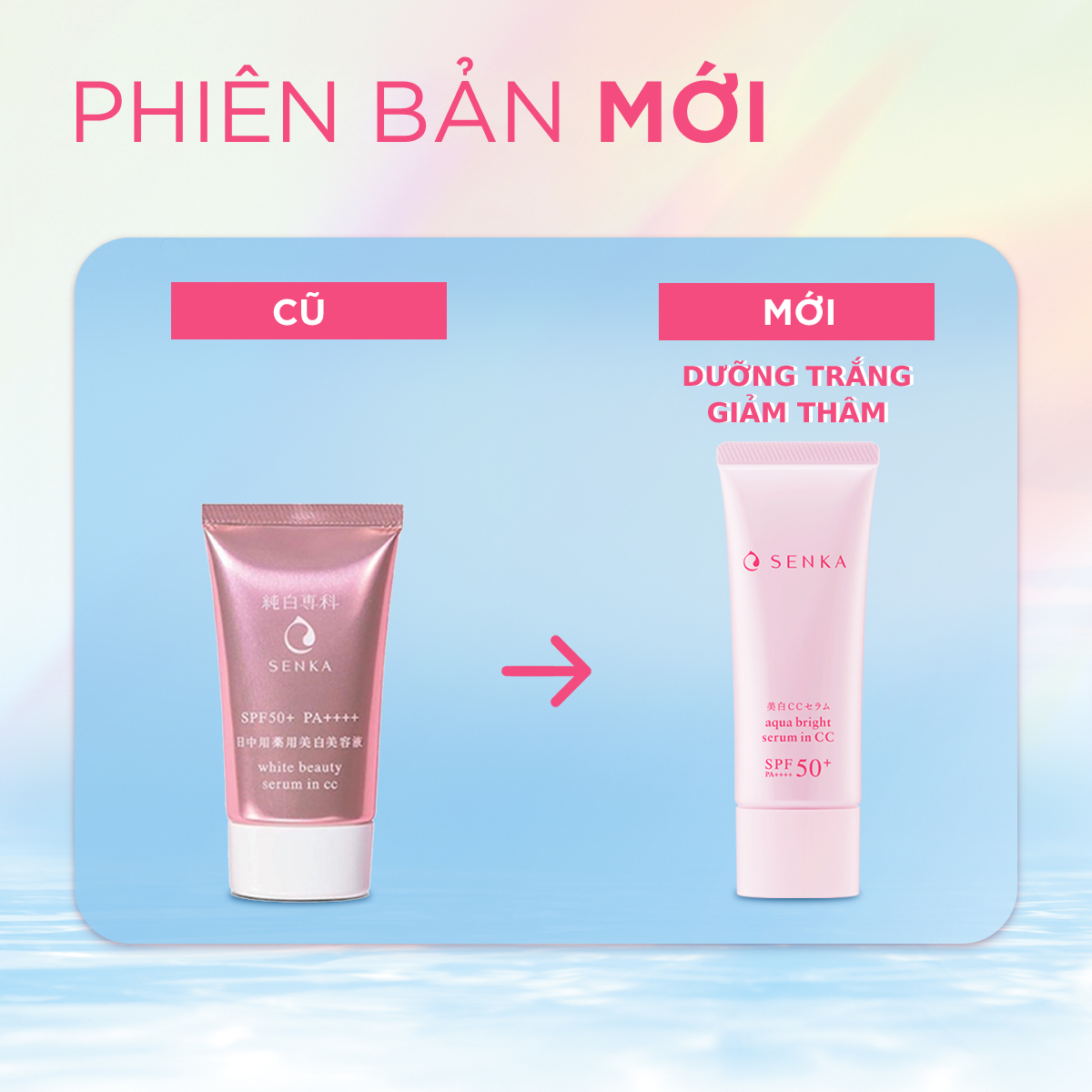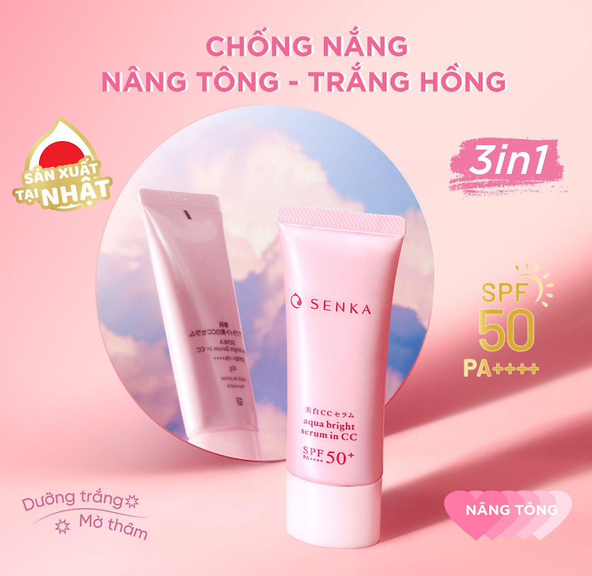 - Serum Dưỡng Trắng Da Senka Kết Cấu CC White Beauty CC Serum giúp giảm thâm nám, sạm mụn và tàn nhang trên da nhờ vào phức hợp làm trắng M-Tranexamic acid, Tinh chất Hoa Anh Đào, Tơ Tằm Trắng, Cám Gạo, Mật Ong, giúp da trắng hồng, trong mướt. - Chỉ số SPF 50+ chống lại tia UVB, tác nhân gây sạm da, cháy nắng&hellip , chỉ số PA++++ chống lại tia UVA, tác nhân gây đốm nâu, tàn nhang và lão hóa. - Hạt phấn siêu mịn giúp lớp trang điểm bám tốt hơn, cho lớp nền mịn mượt và không bị bong tróc.