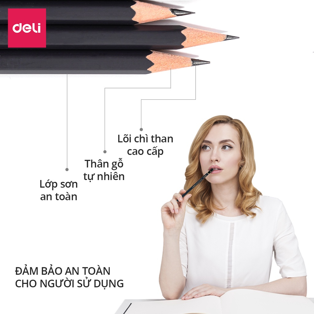 - Bút chì Deli - Viết chì là một vật dụng không thể thiếu đối với các bạn học sinh và giới văn phòng. - Chất liệu gỗ trầm mềm, giúp việc gọt bút trở