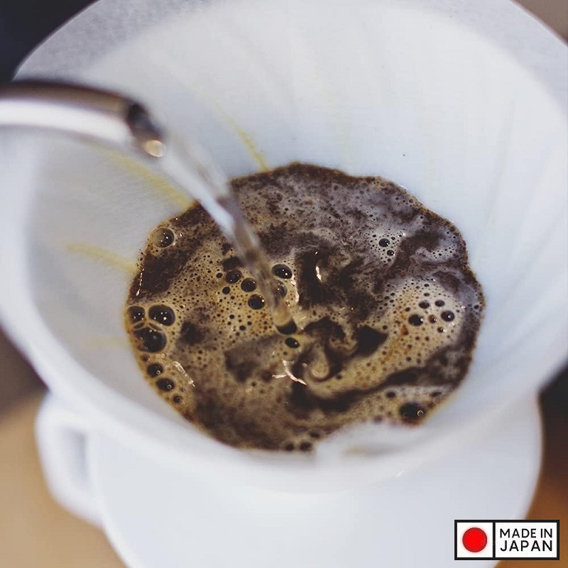 • Đặt túi giấy lọc cà phê vào phễu kalita, tráng qua bằng nước sôi